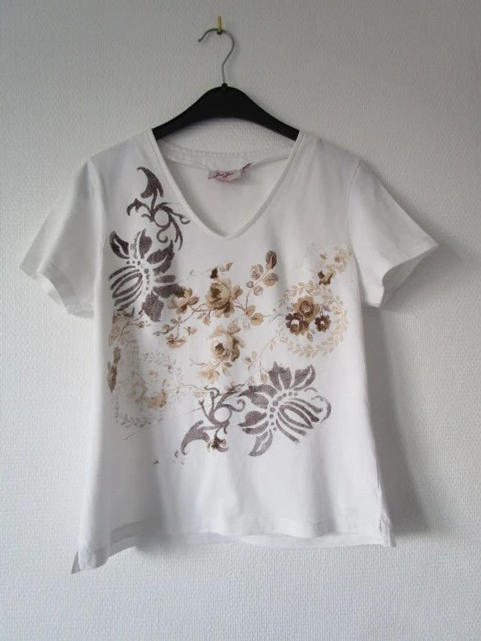 T-shirt blanc fleurs beige Jac Jac 38 TBE - photo numéro 8