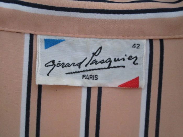 Chemisier abricot rayé noir et écru taille 42 Marque Gérard Pasquier Fausses poches sur le devant 100% polyester Largeur carrure : 42 cm Largeur aisselle à aisselle : 53 cm Longueur : 61 cm En parfait état #mamanbrade59femme42