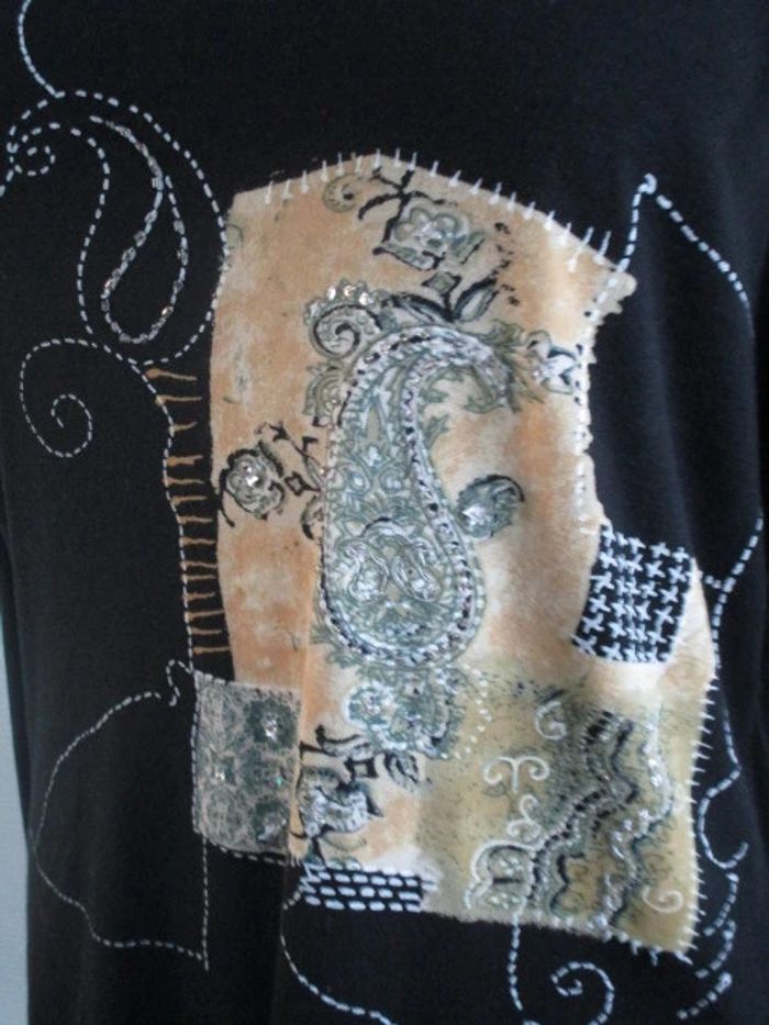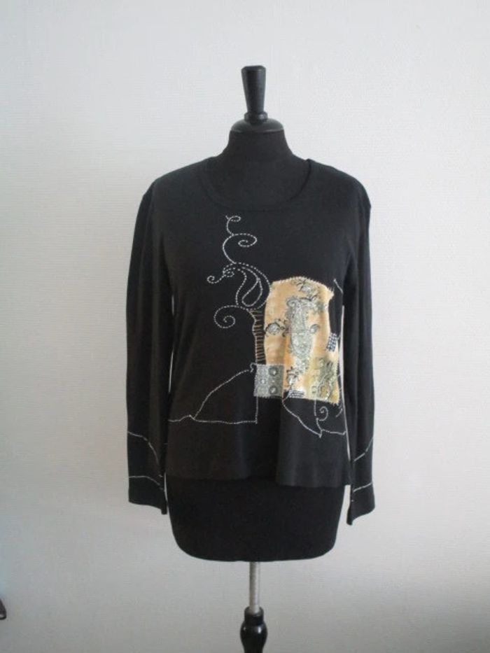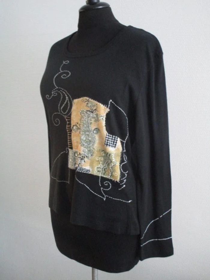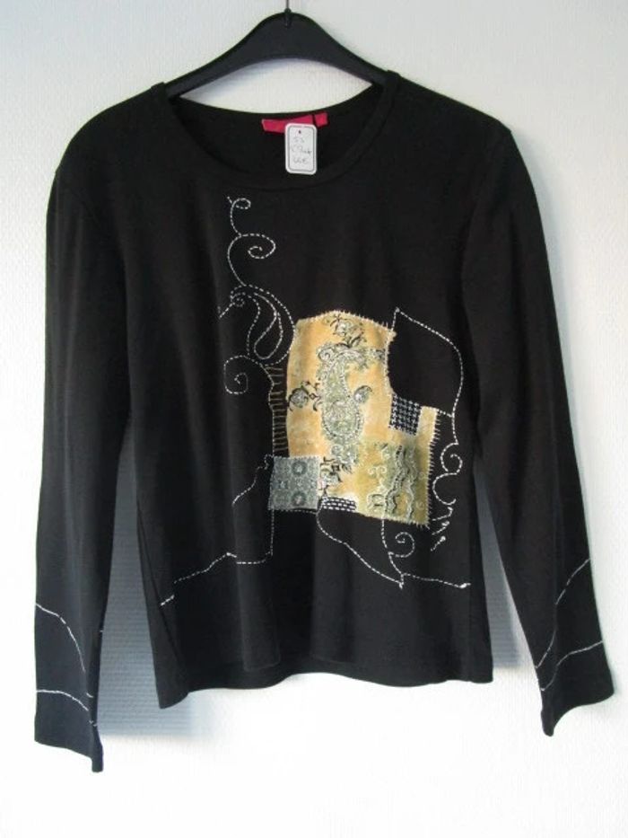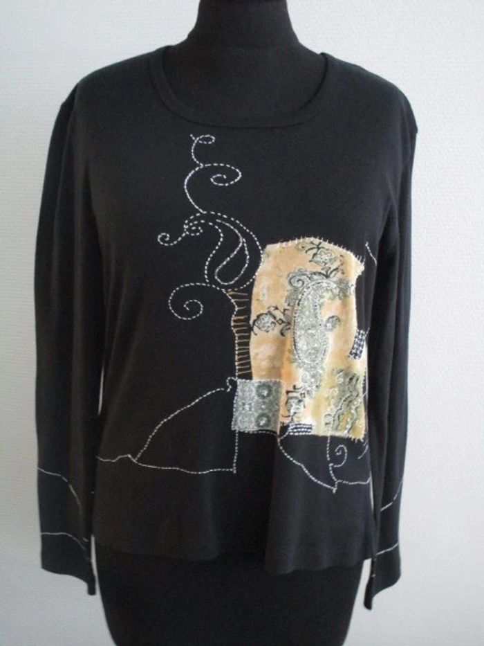 T-shirt noir de marque Jac Jac taille 2 soit 40 Motifs beige/blanc/kaki avec petites perles sur le devant Manches longues Col rond Assez court Pas d'étiquette de composition Largeur carrure : 45 cm Largeur aisselle à aisselle : 50.5 cm Longueur : 58 cm NEUF avec étiquette Prix boutique : 36 euros #mamanbrade59femme40