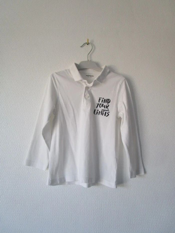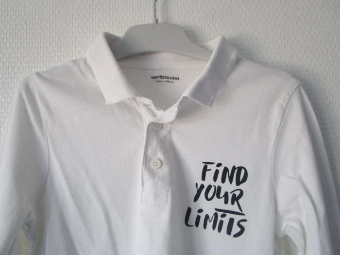 Polo léger blanc de marque Vertbaudet taille 5 ans Flocage message "Find your limits" côté gauche de la poitrine Manches longues En très bon état, très peu porté #mamanbrade59garçon5ans
