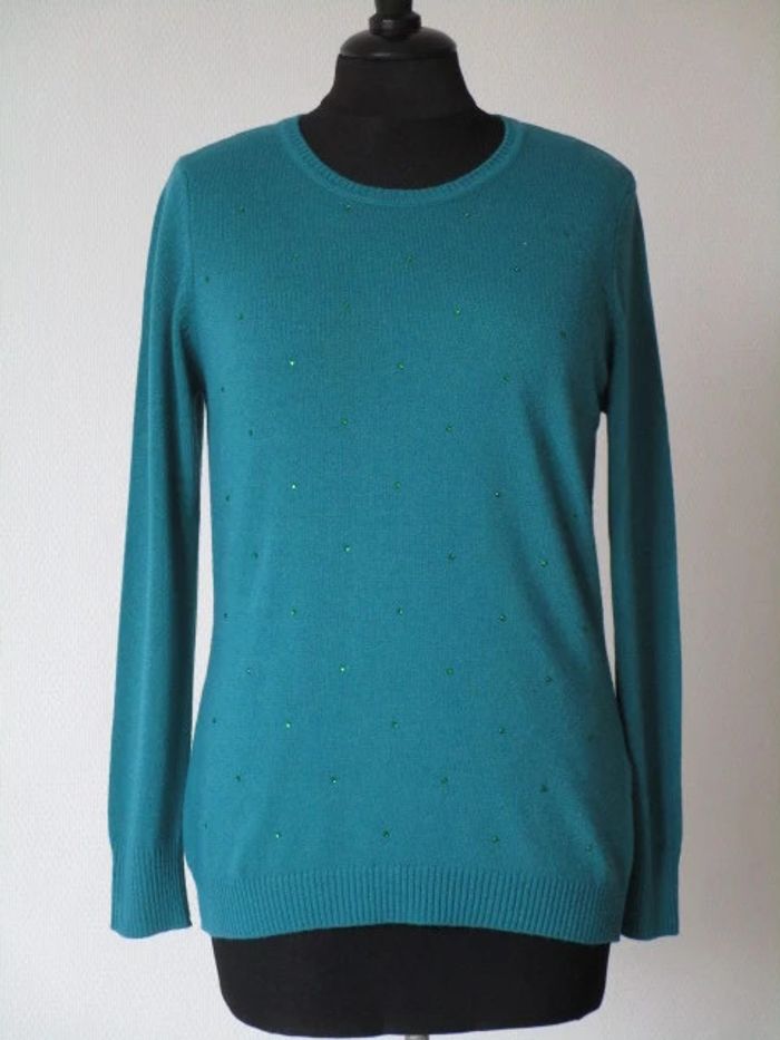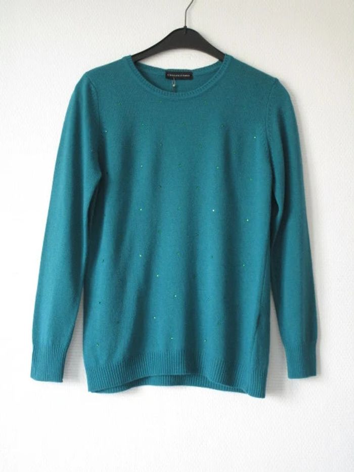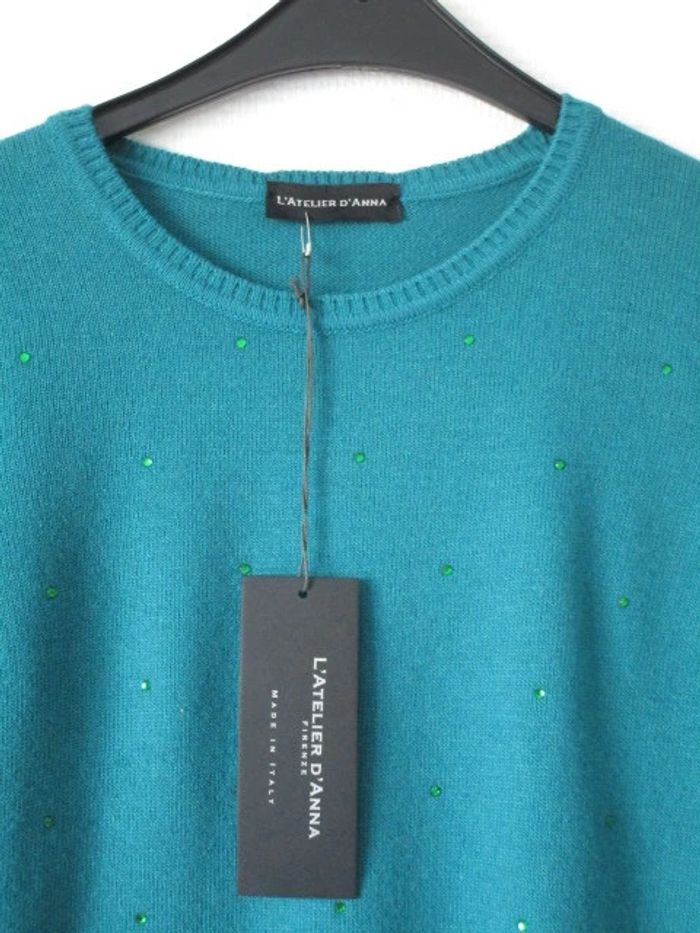 Pull vert sapin (les photos lui donnent un faux aspect turquoise) de marque L'Atelier d'Anna Noté taille M mais correspond plutôt à du S (36) (cf mesures) Col rond Manches longues Petits strass ton sur ton sur le devant Fabriqué en Italie 40% laine/30% viscose/20% polyamide/10% cachemire Largeur carrure : 36 cm Largeur aisselle à aisselle : 45 cm Longueur : 62 cm NEUF avec étiquette #mamanbrade59femme36