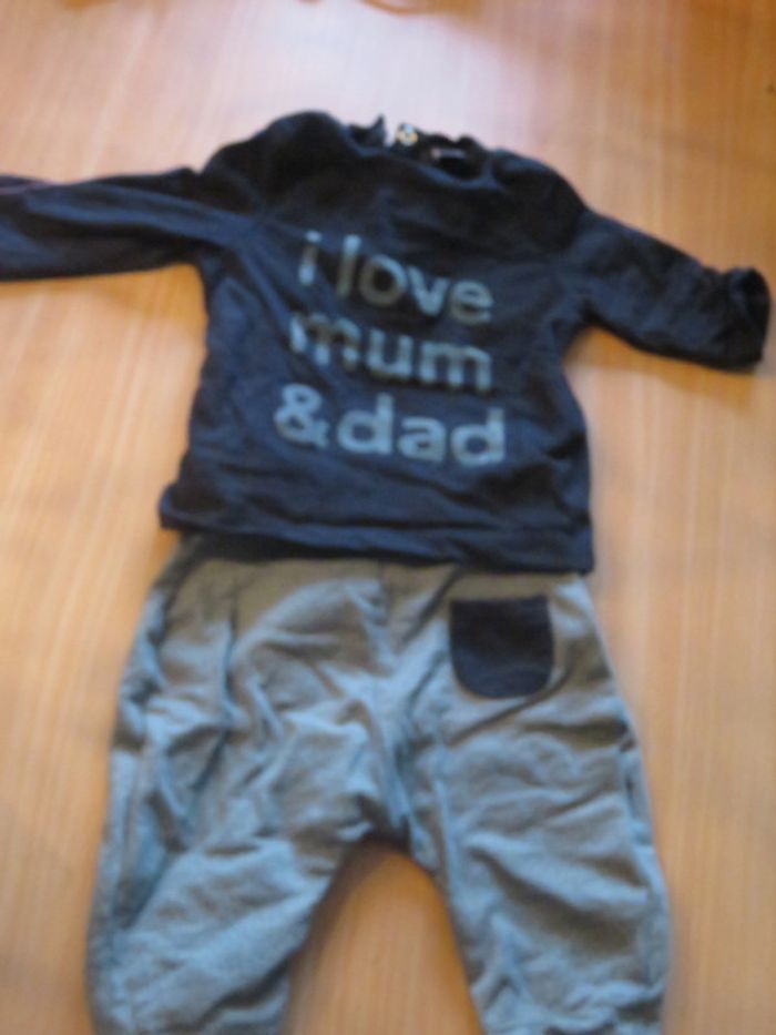 ensemble composé d'un pantalon avec taille élastique et d'un t shirt manches longues fermés par 3 pressions sur l'arrière du dos #mlledrey521moisgarçon
