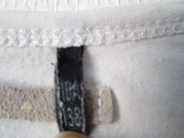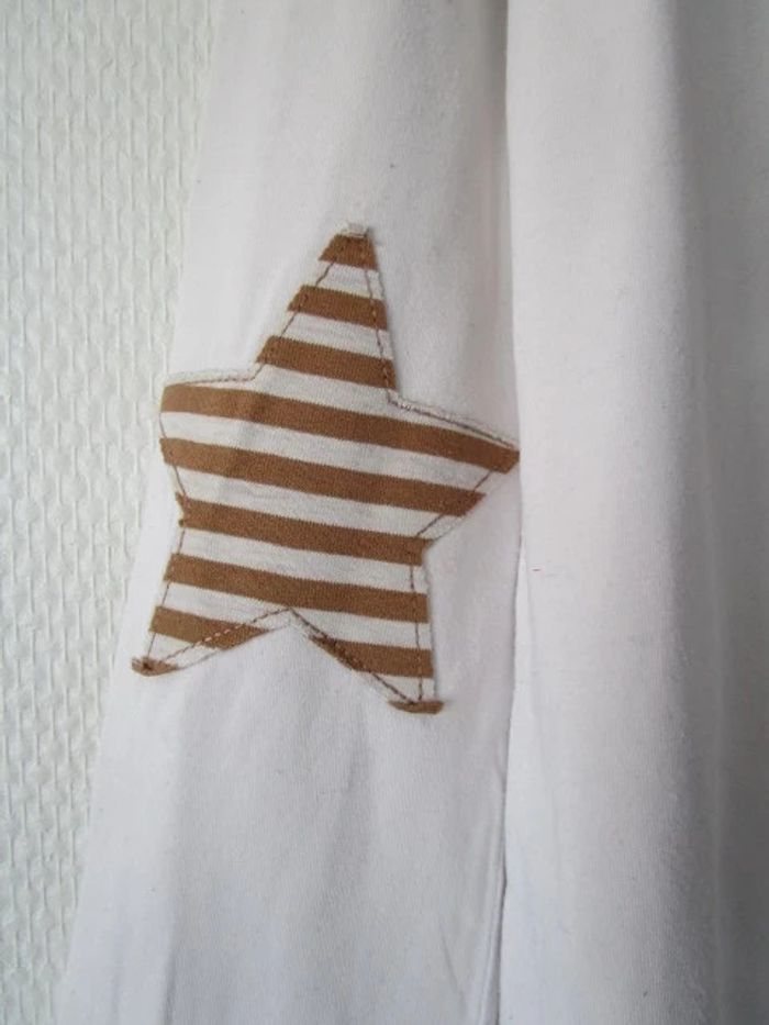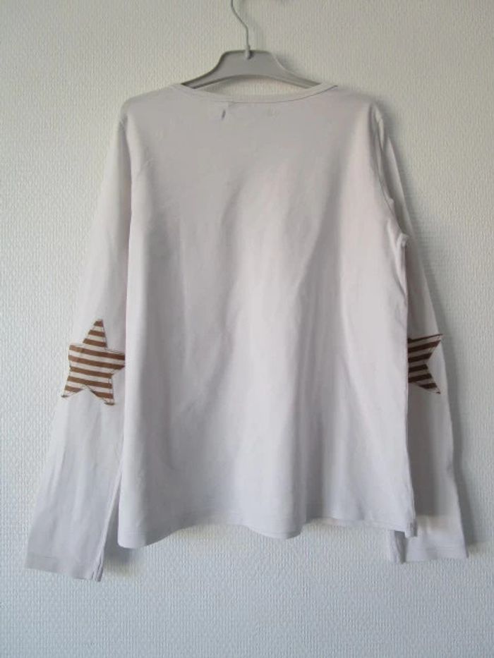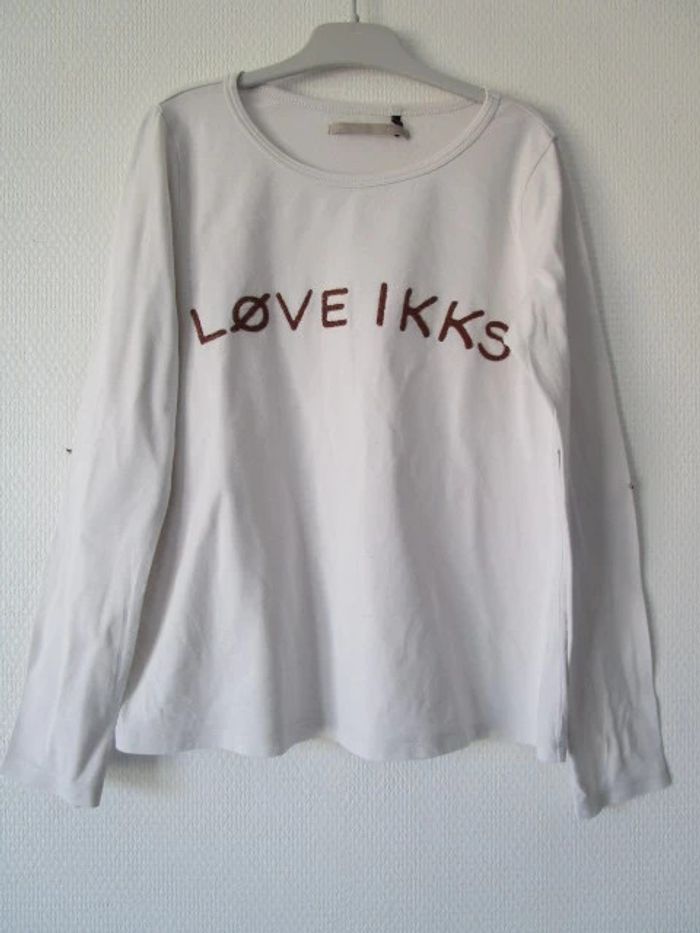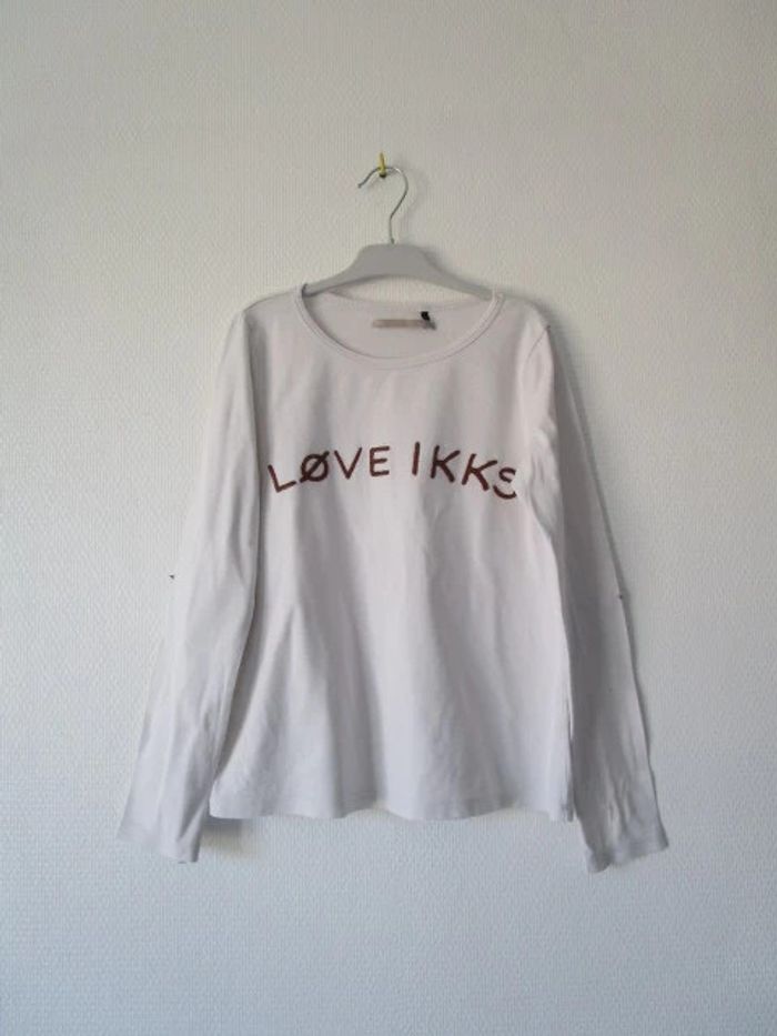 T-shirt blanc de marque IKKS taille 10 ans Message "Love IKKS" couleur bronze sur le devant Etoiles rayées bronze et blanc comme coudières En bon état, beaucoup porté mais pas de trou, pas de tâche #mamanbrade59fille10ans