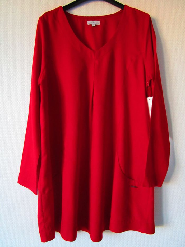 Robe rouge de marque Agathe & Louise taille 2 soit 38/40 (cf mesures) Col V Manches longues Forme ample, fluide Assez courte Larges poches sur l'avant, dans le bas Pas d'étiquette de composition Largeur carrure : 38.5 cm Largeur aisselle à aisselle : 51 cm Longueur : 85 cm NEUVE avec étiquette #mamanbrade59femme38 #mamanbrade59femme40