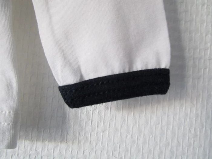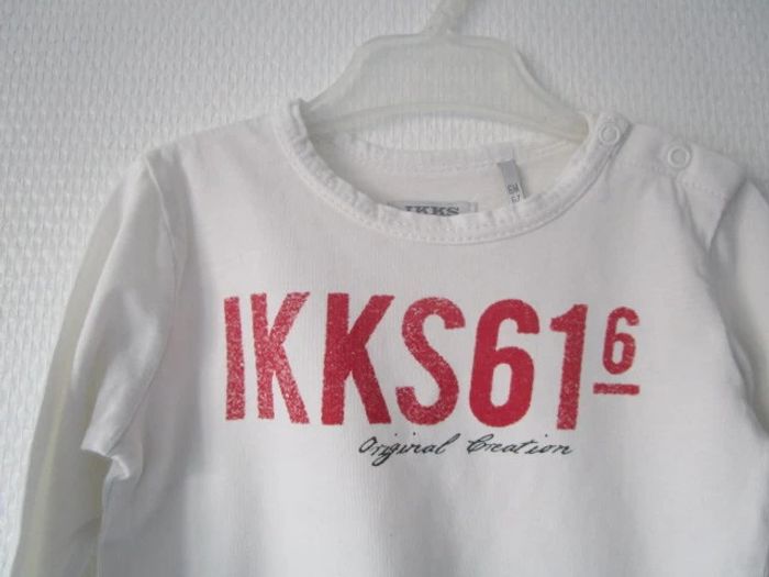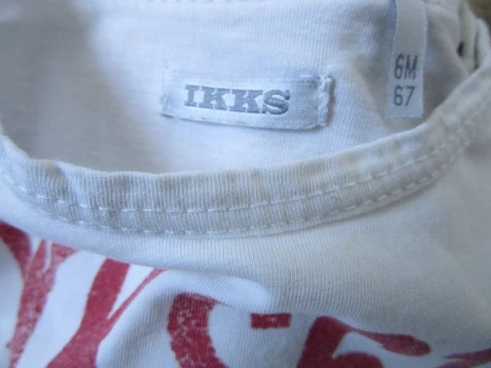 T-shirt blanc de marque IKKS taille 6 mois Inscription rouge sur le devant et bords des manches longues noirs 100% coton En très bon état #mamanbrade59garçon6mois