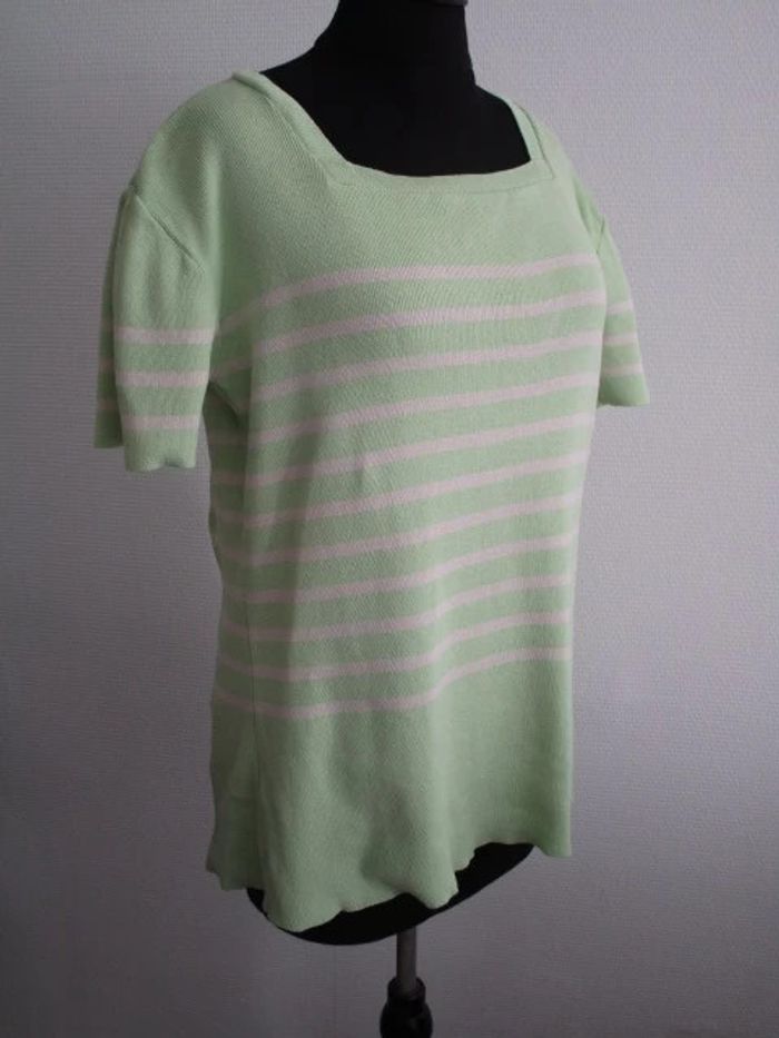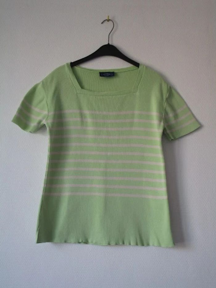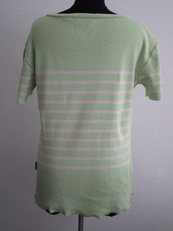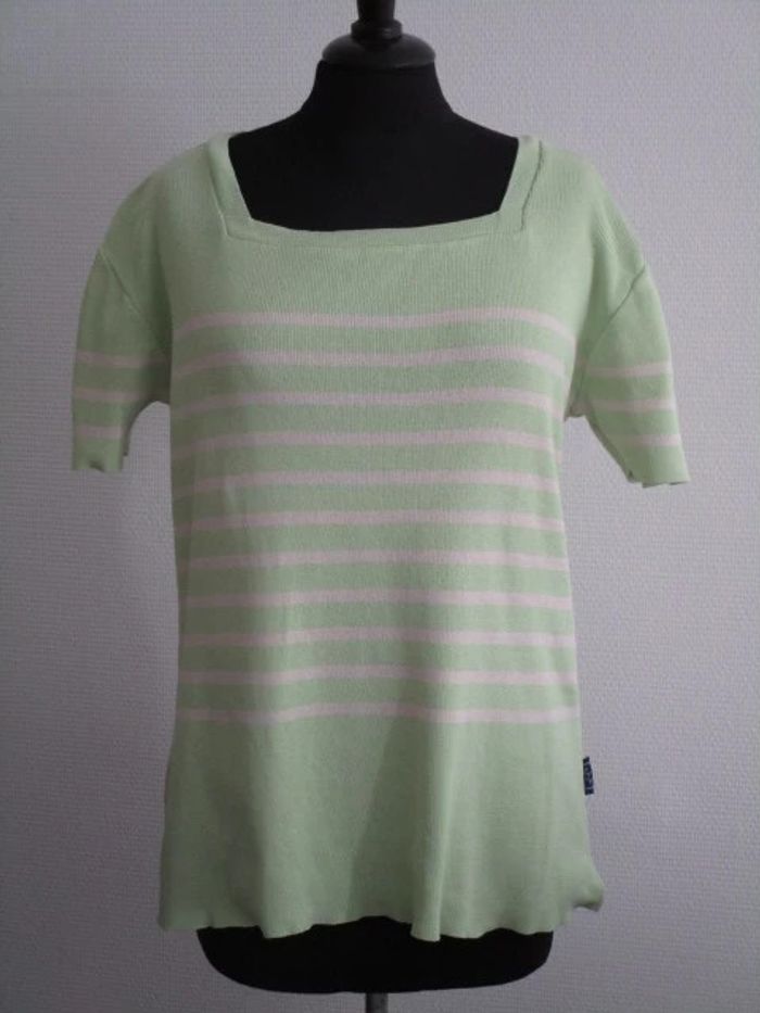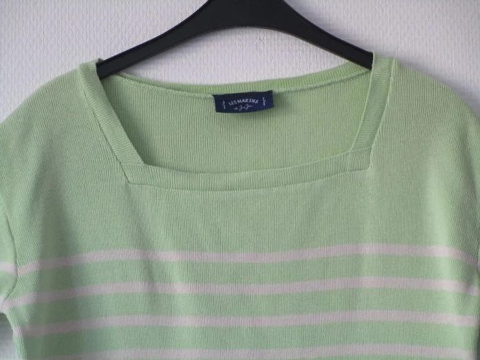 Pull de marque Les Marins de Jac Jac Pas d'étiquette de taille mais correspond à une taille 42 Style marinière vert anis rayé crème Manches courtes Col carré Pas d'étiquette de composition Largeur carrure : 48 cm Largeur aisselle à aisselle : 50 cm Longueur : 63 cm En très bon état #mamanbrade59femme42
