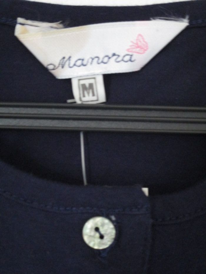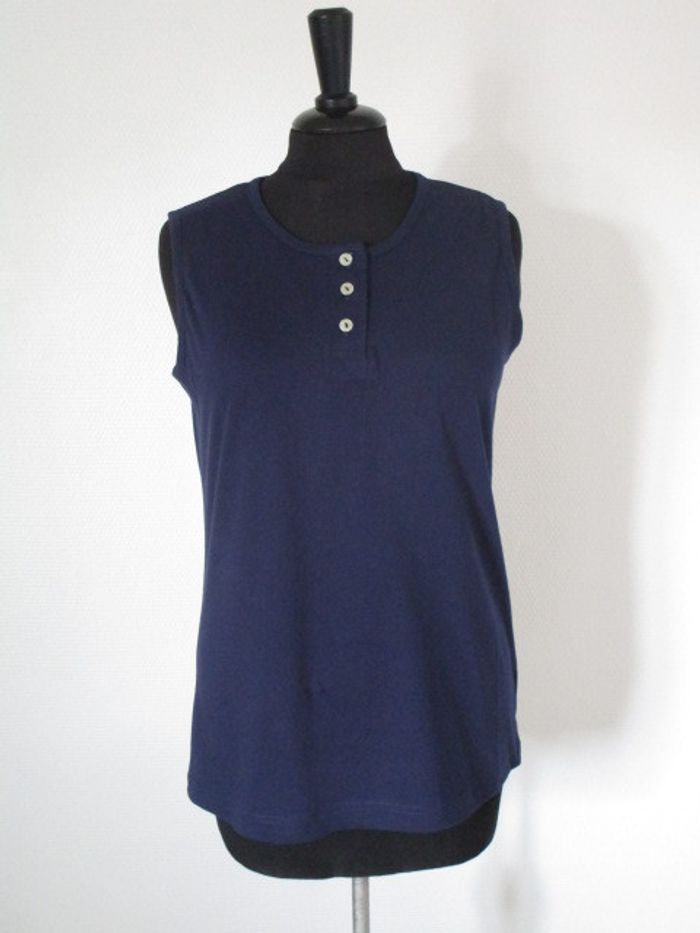 Débardeur uni bleu marine de marque Manore taille M/38 Taille bien, peut convenir à une taille 40 Petits boutons au niveau du décolleté 100% coton Largeur aisselle à aisselle : 47.5 cm Longueur : 65 cm NEUF avec étiquette #mamanbrade59femme38 #mamanbrade59femme40