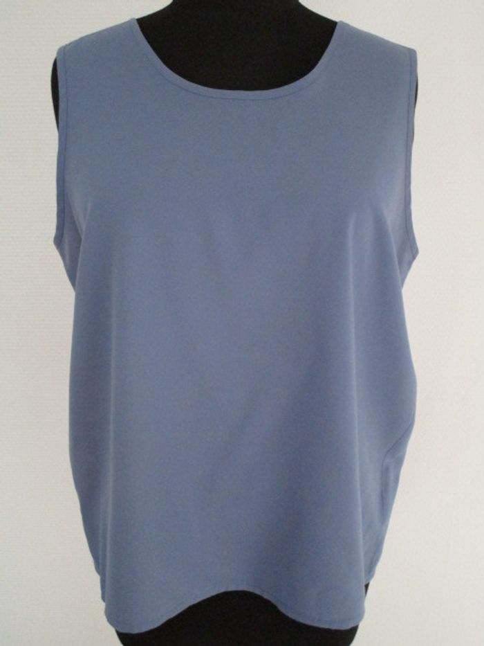 Blouse bleue vintage taille 42 (étiquetée 44 mais correspond plutôt à un 42 actuel) Sans manches Col rond En très bon état mais toute petite tâche sur le devant 60% viscose/40% polyester Largeur aisselle à aisselle : 51 cm Longueur : 60 cm #mamanbrade59femme42