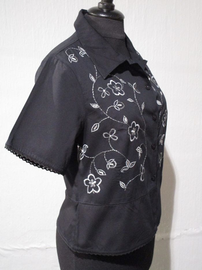 Chemisette noire de marque Jac Jac taille 2 soit 40 Broderies gris pâle sur le devant Assez courte Pas d'étiquette de composition mais doit être 100% coton Largeur carrure : 38.5 cm Largeur poitrine (aisselle à aisselle) : 48 cm Longueur : 52 cm NEUVE avec étiquette Prix boutique : 38 euros #mamanbrade59femme40