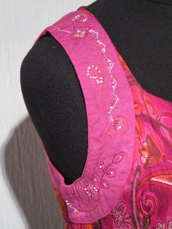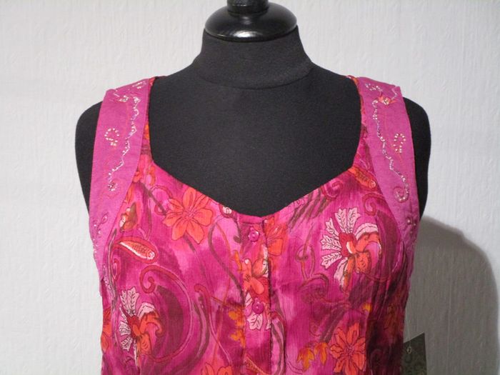 Top sans manches fuchsia en voile imprimé Marque Jac Jac taille 2 soit 40 Bande rose avec broderies et fines perles au niveau des emmanchures. Totalement boutonnée sur le devant Doublée Pas d'étiquette de composition mais doit être 100% viscose Largeur poitrine (aisselle à aisselle) : 45.5 cm Longueur : 61 cm NEUF avec étiquette Prix boutique : 50 euros #mamanbrade59femme40