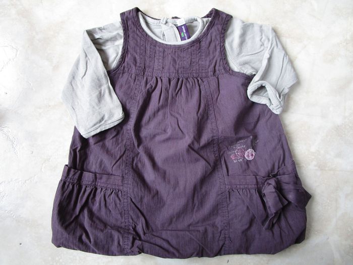 Robe Sergent Major couleur prune avec t-shirt assorti gris. Le t-shirt s'ouvre tout le long du dos par des pressions. La robe s'ouvre avec un zip dans le dos. Robe en très bon état mais t-shirt un peu feutré. #mamanbrade59fille6mois