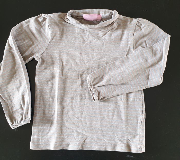 T-shirt à manches longues, gris clair à rayures, en bon état. Le bas des manches est élastiqué. L’étiquette de la composition a été coupée, mais il me semble que c’est du coton, peut-être mélangé ? NKY 8 ans – 128 cm Les mesures, prises à plat, sont données à titre indicatif et peuvent varier de quelques millimètres. -Largeur épaules : 26 cm - Largeur emmanchure : 31 cm - Longueur : 37 cm - Longueur de manche : Dessus 38 cm – Dessous 29 cm Envoi rapide et soigné.