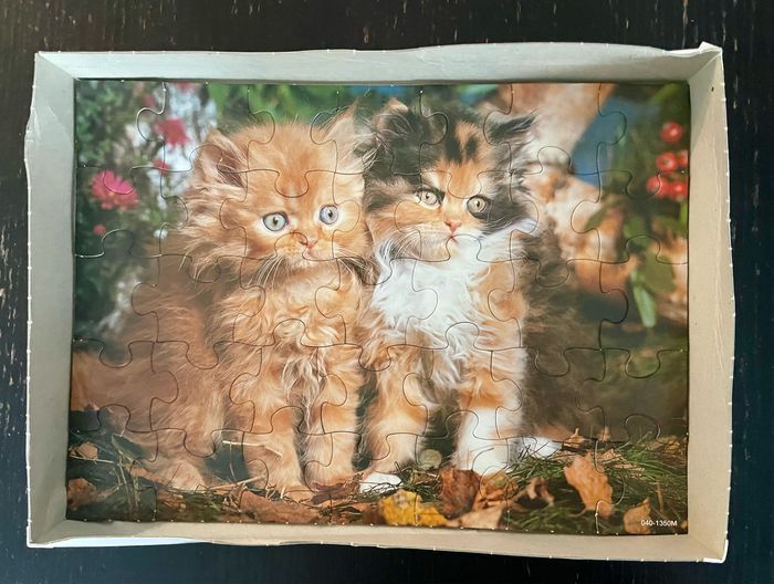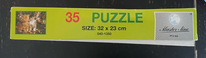 Puzzle de 35 pièces Dimensions 32x23 cm Motif chats Carton abîmé Traces d’utilisation Occasion, bon état