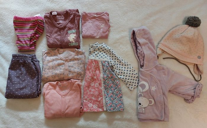 Lot vêtements fille, 6 mois. 8 pièces : pantalon, 3 pyjamas, t shirt manches longues, robe, gilet molletonné, bonnet + 1 collant Bon état. Maison non fumeur et sans animaux.
