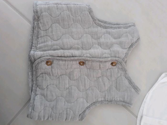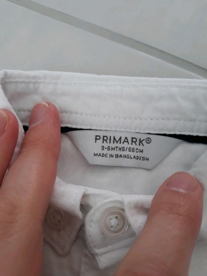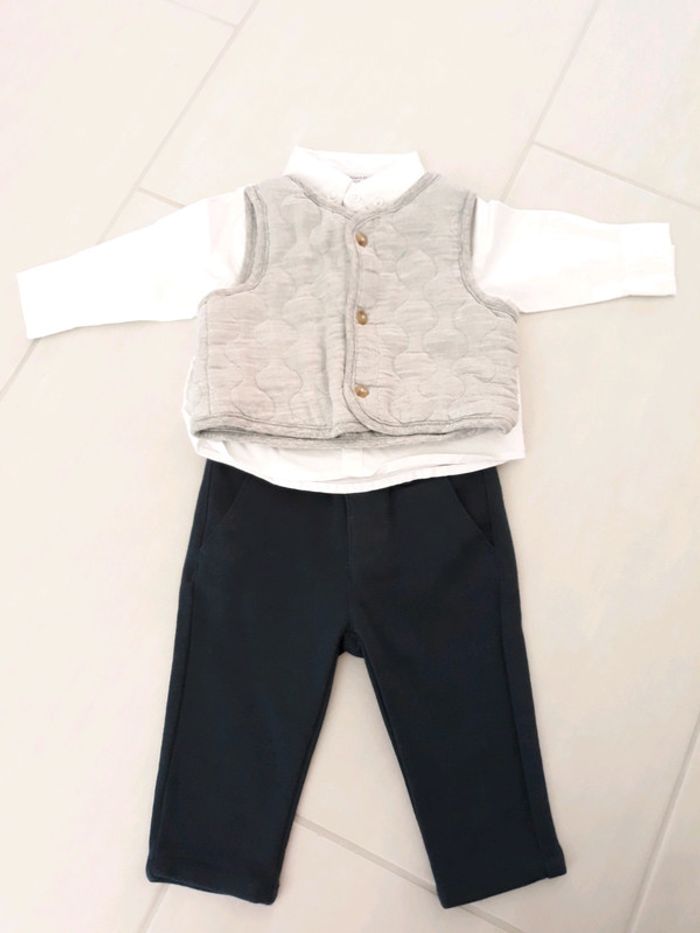 Ensemble chic comprenant : - un pantalon bleu foncé marque Z - une chemise blanche neuve Primark - un gilet gris sans manches tape à l œil Taille 6 mois Excellent etat, jamais porté.