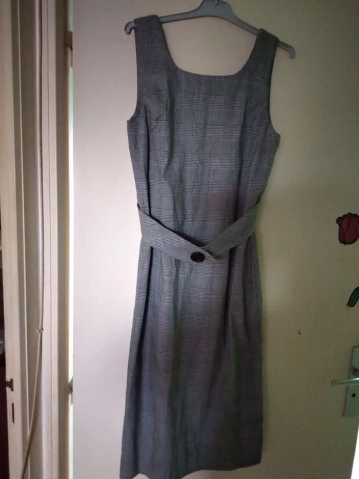 Peu portée robe longue droite avec petite fente en bas dans le dos, dos légèrement découvert, fermeture éclair, ceinture intégrée à la robe. Robe très classe. Imprimé Prince de Galles.