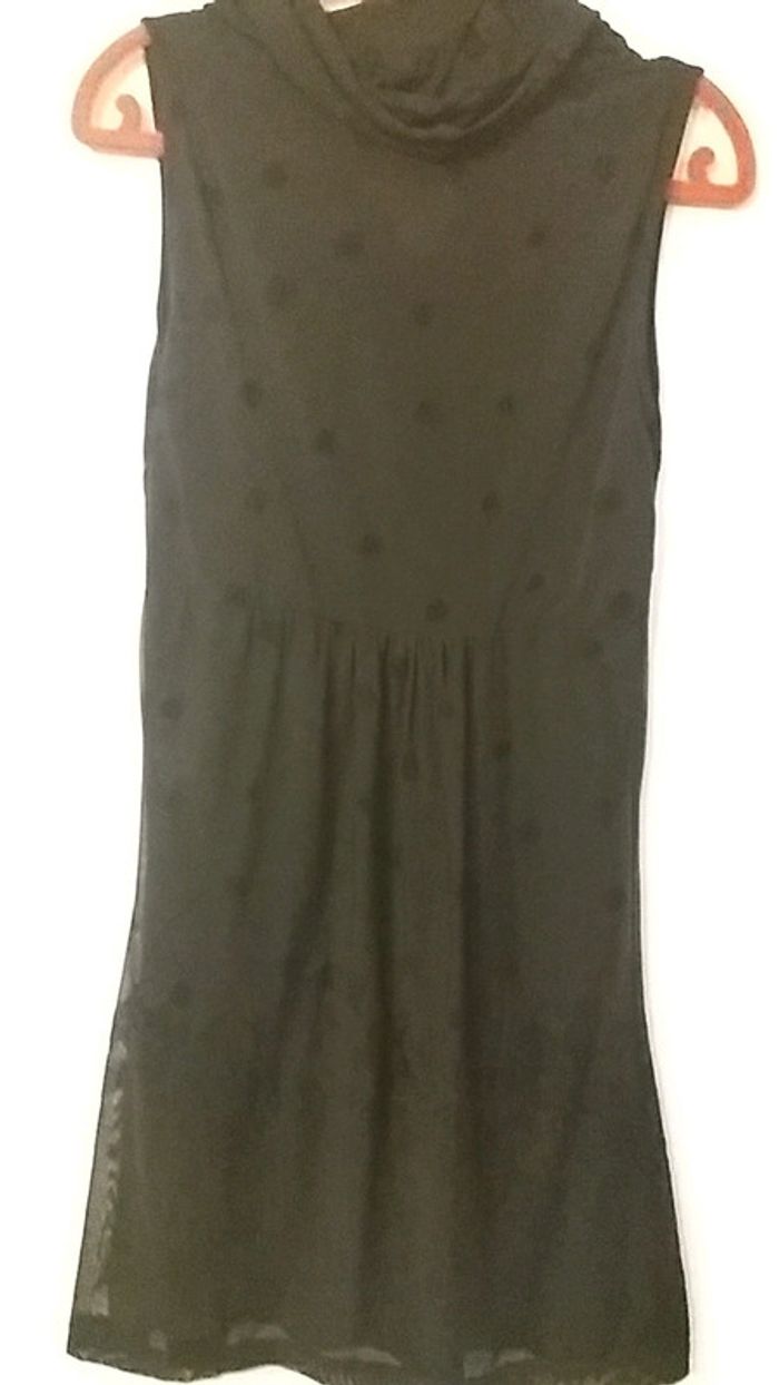 Très jolie robe noire doublée en voile avec broderies sans manche, col tombant