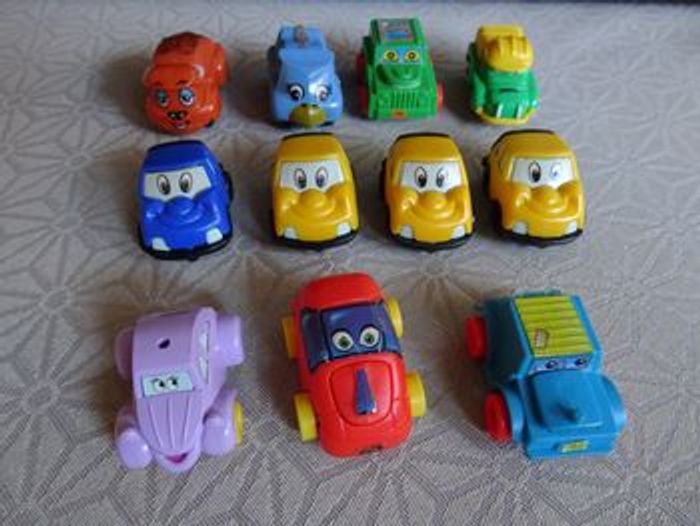 Lot de 11 mini voitures en plastique kinder surprise, voitures avec des yeux, très bon état. 3/4 cm de longueur.