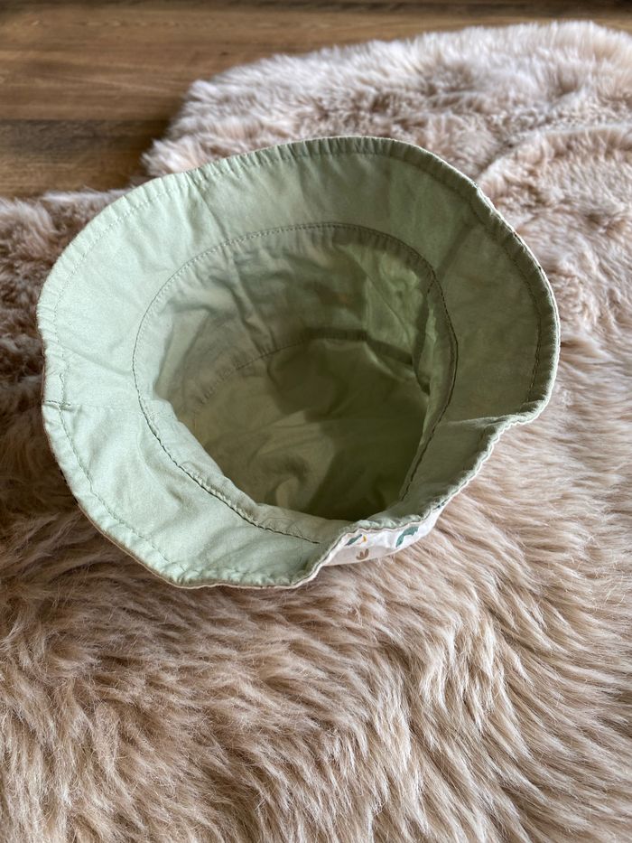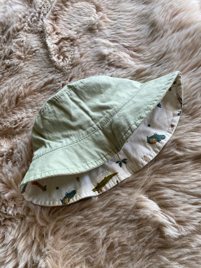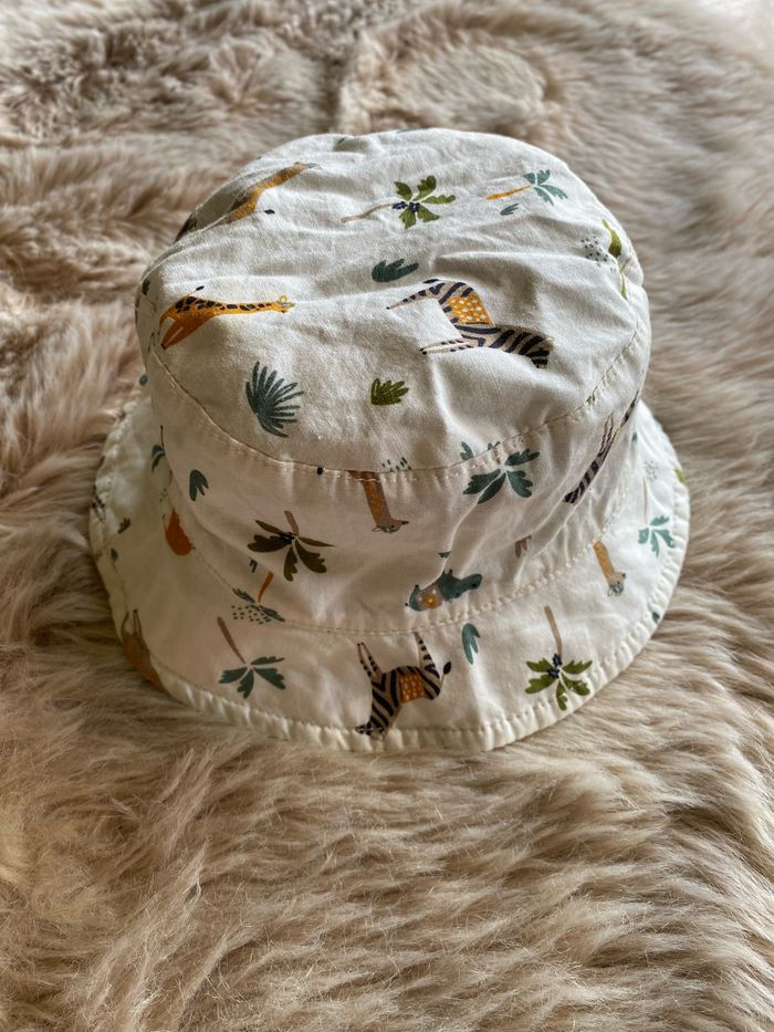 Bob bébé taille 9 mois petit Beguin réversible, un côté beige avec animaux de la savane et un côté vert kaki clair.