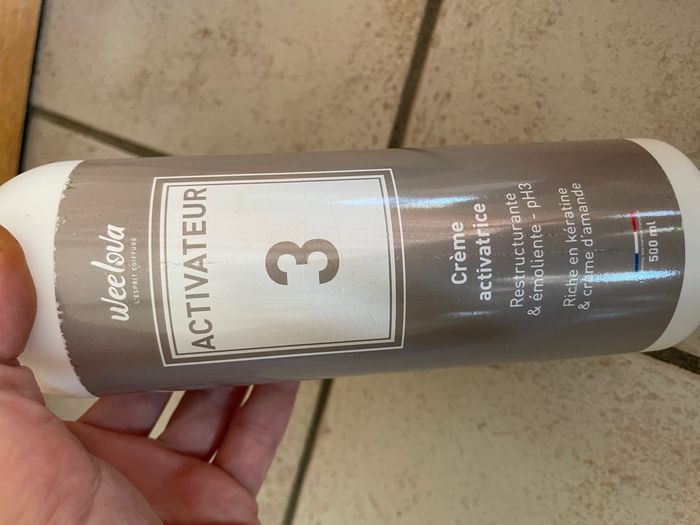 Flacon d'activateur / révélateur pour couleur de marque WeeLova ou autre Crème activatrice 3 Restructurante et émolliente pH3 Grand format (500ml) Riche en kératine et crème d'amande J'en ai utilisé un tout petit peu, le flacon est quasiment plein et il a été acheté tout récemment J'ai également des couleurs Pigmova de chez WeeLova à vendre (coloration à l'huile)