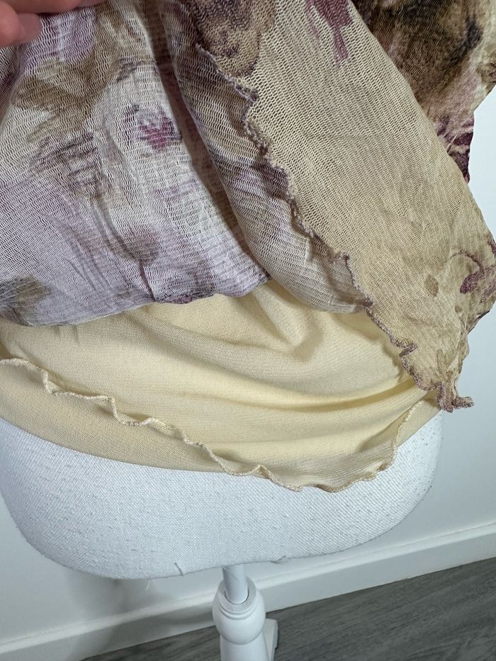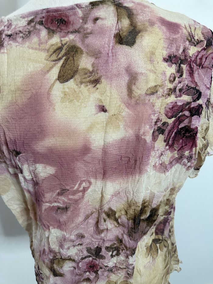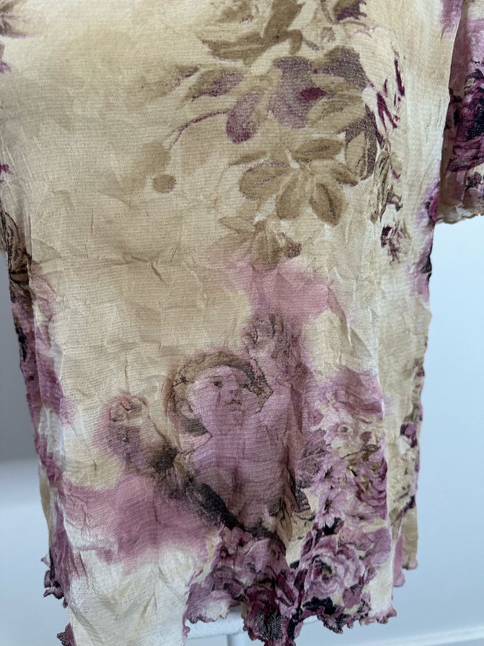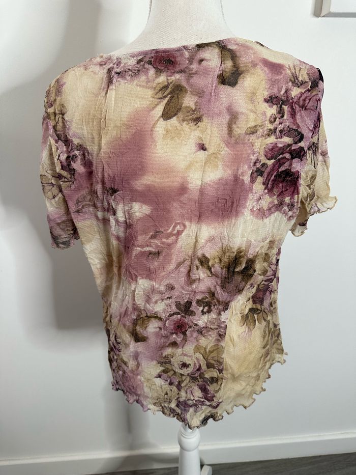 T-shirt en mesh - Excellent état - Taille 42/44 équivalent XL/XXL - Beige crème et rose violet - Imprimés fleurs - Doublure intérieure - Col rond - Manches courtes - Style Y2K, 2YK - Polyester et polyamide