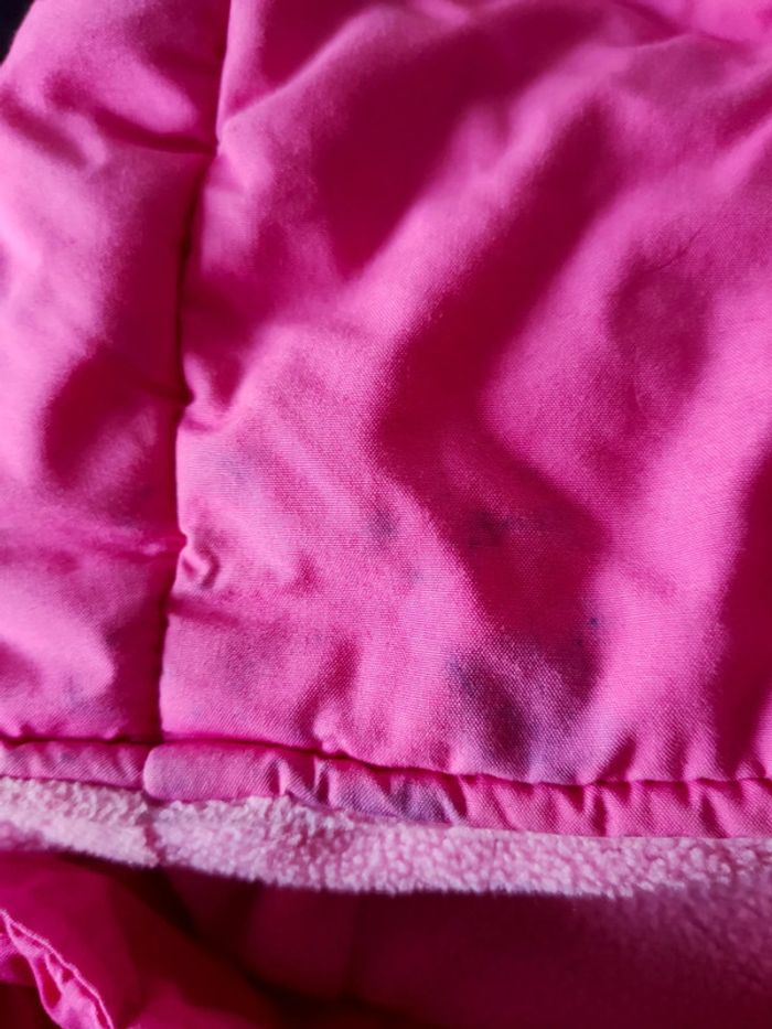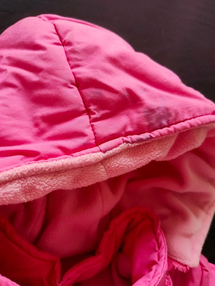 Manteau épais chaud intérieur rose clair prémaman 18 mois - tâche bleu ( voir photo ) sur la capuche a cacher avec un patch - la capuche est à fermeture éclair retirable voir photo bien porté Sans capuche très bon état Capuche état satisfaisant