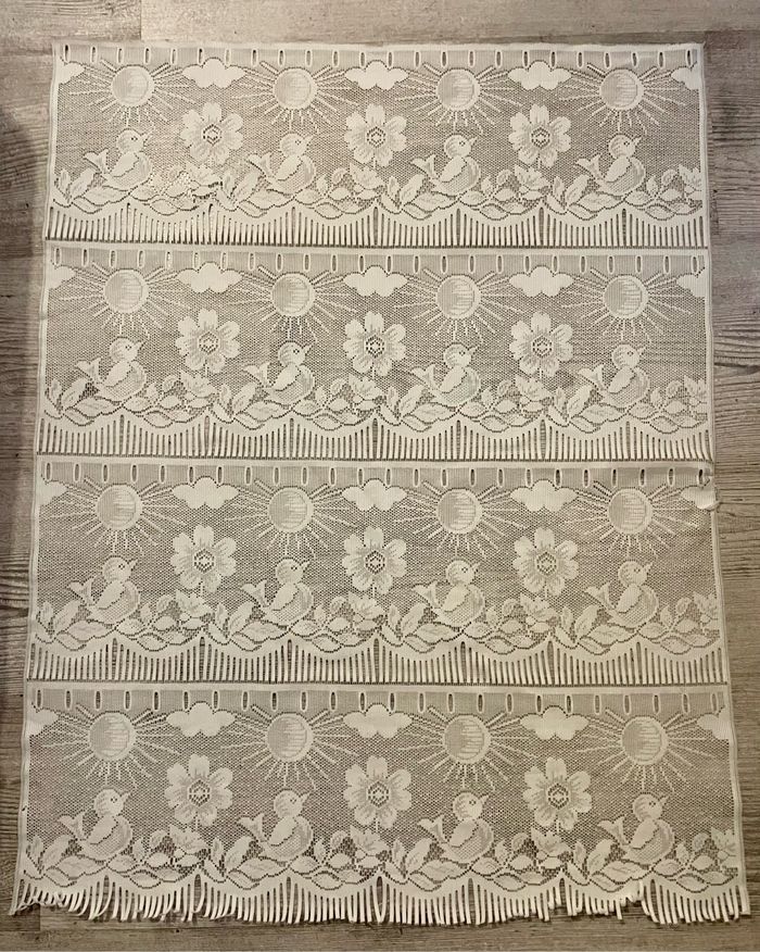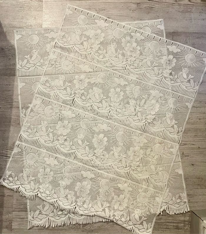 Lot de 2 rideaux voilages Motifs oiseaux et fleurs Dimensions 61x78cm Présence d’un défaut sur un des rideaux (voir photo) Occasion, bon état