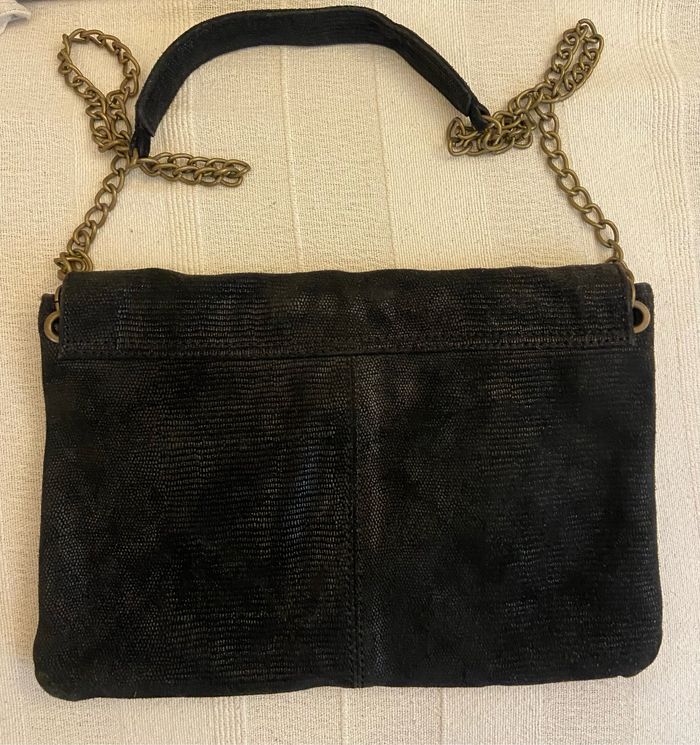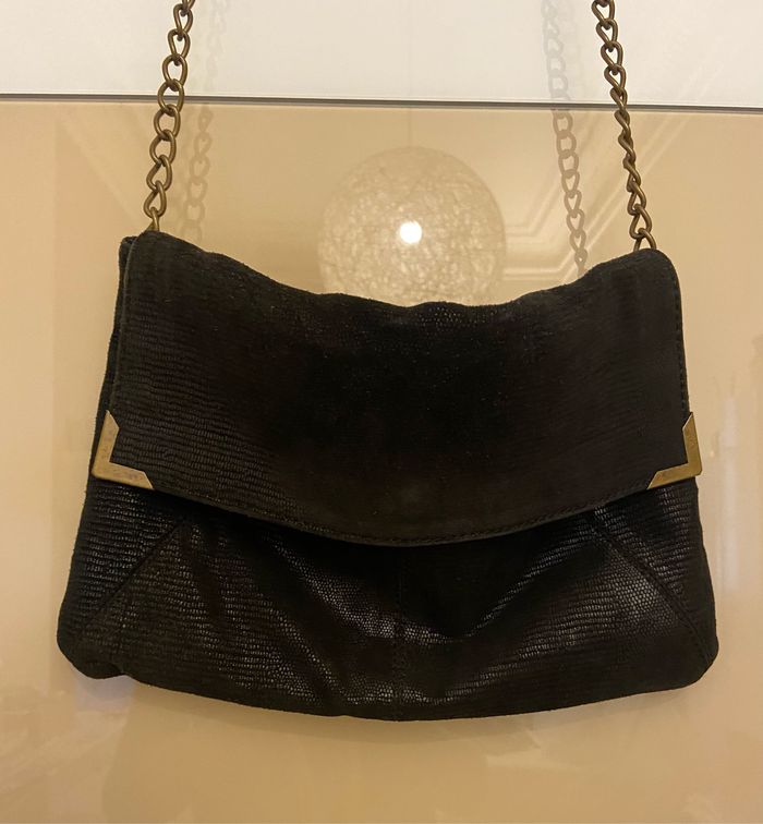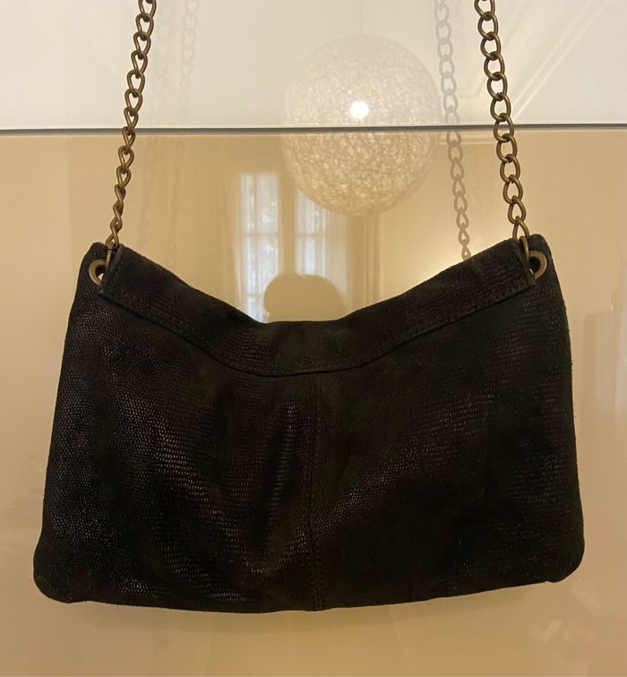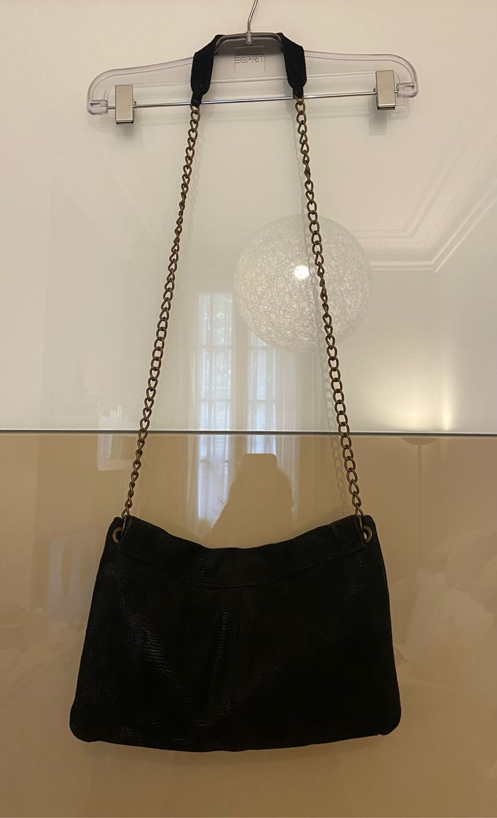 Sac noir imitation daim Effet huilé Noir Chaîne dorée Longueur 32 cm Hauteur 20 Cm Fermeture aimantée Marque Promod Porté à l’épaule ou bandoulière
