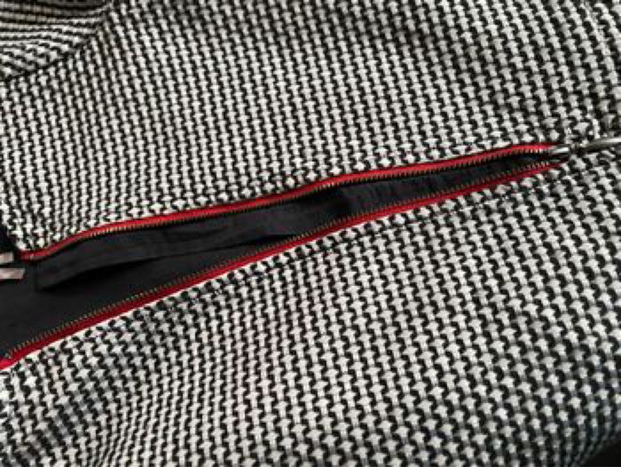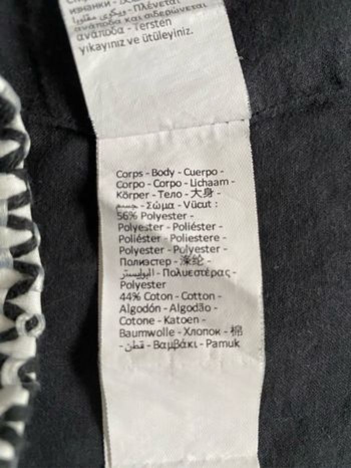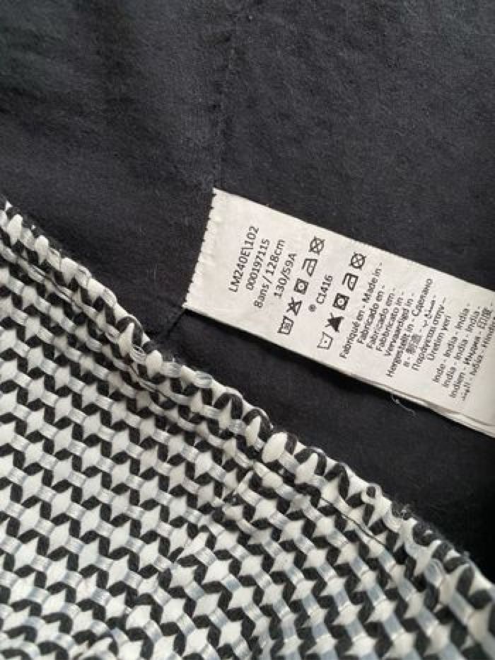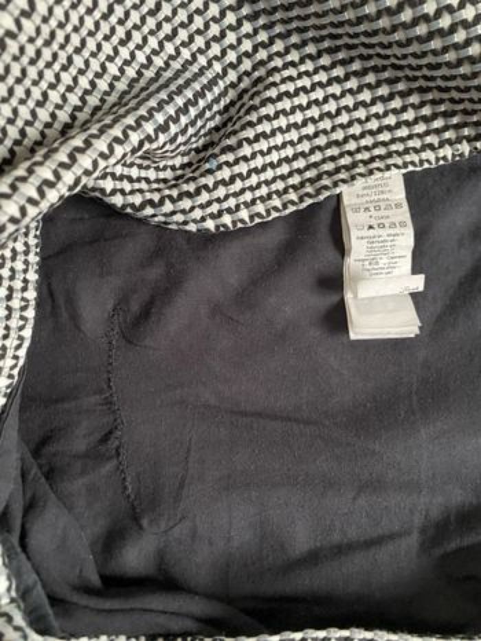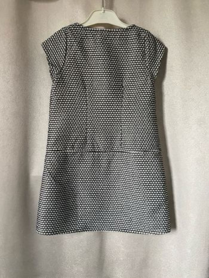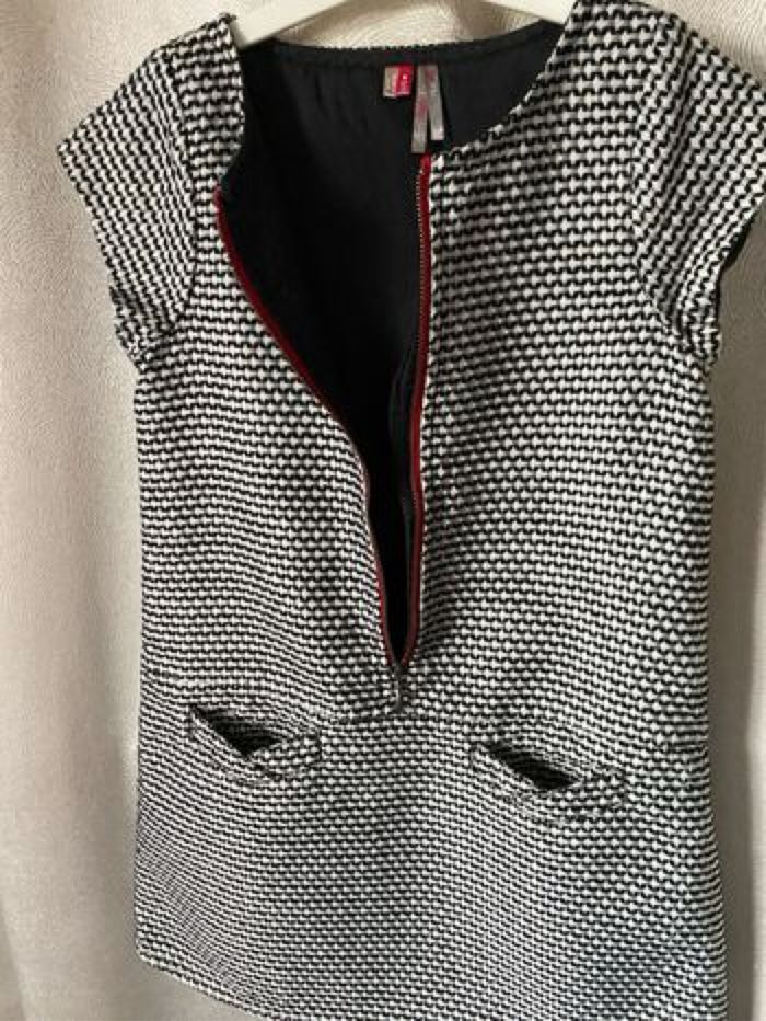 Robe manches courtes 8 ans 128 cm Coloris noir et blanc Jacquard fantaisie "all-over" Doublure unie en voile de coton Ouverture par zip rouge devant Protection anti-pincement 2 poches 56% polyester et 44% coton Orchestra Bon état car tâche bleue en bas devant ( discret, voir photo)