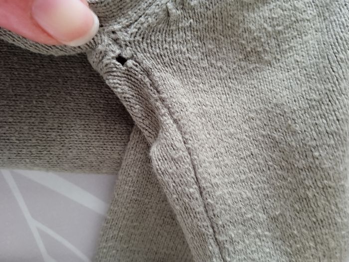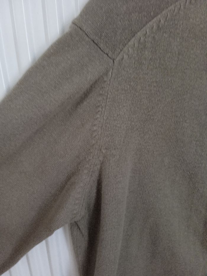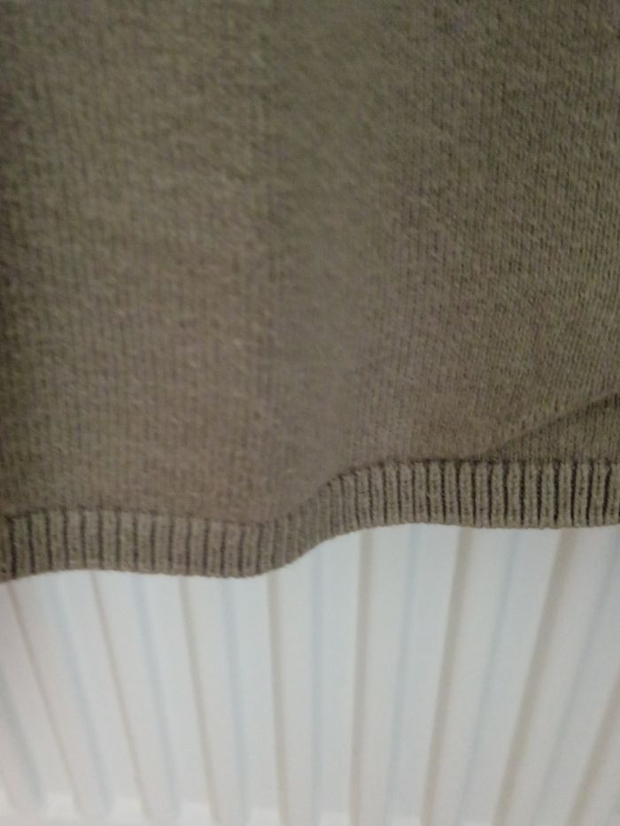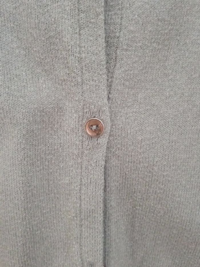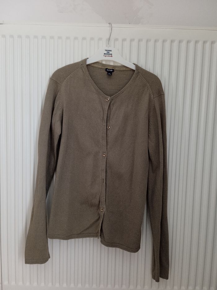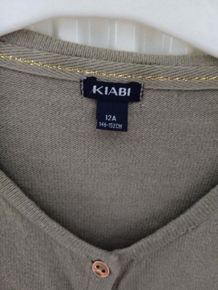 Fermeture bouton sur le devant. Gilet de couleur kaki. Taille 12 ans. Marque Kiabi. Présente un petit défaut en dessous du bras droit léger petit trou voir photos. Pull gris col rond. #fille12ansnade3033