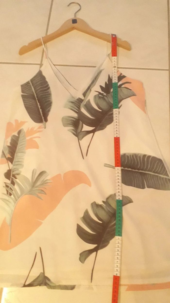 Jolie robe entièrement doublé imprimé tropical dans les tons de vert et saumon. Elle est comme neuve car porté 1 fois. N hésitez pas à découvrir les autres articles de mon dressing! 😉