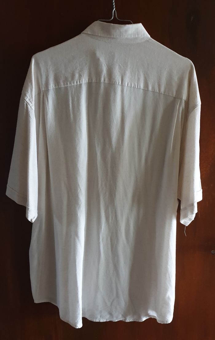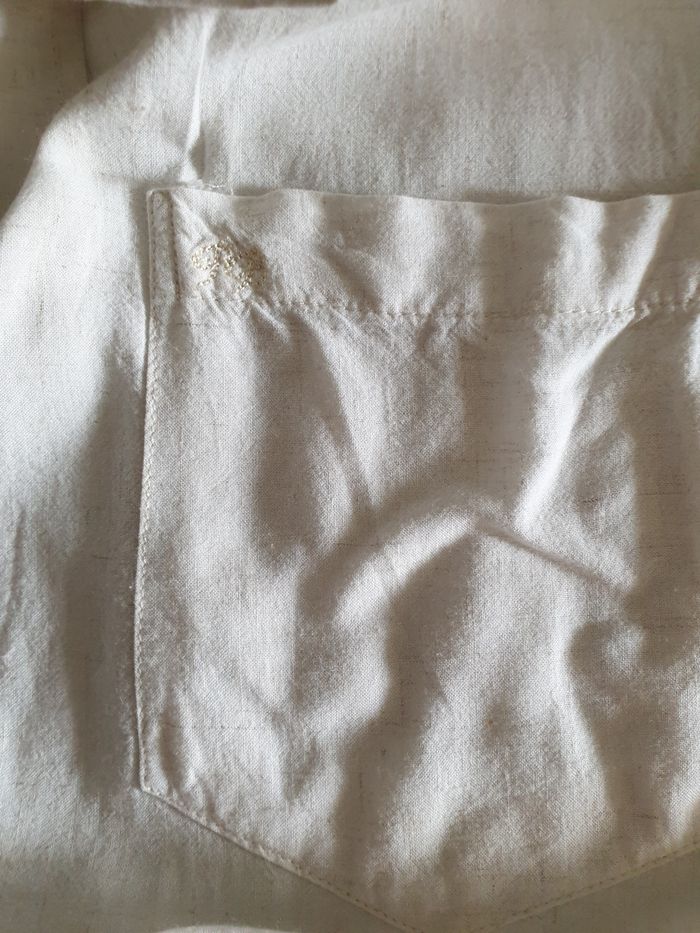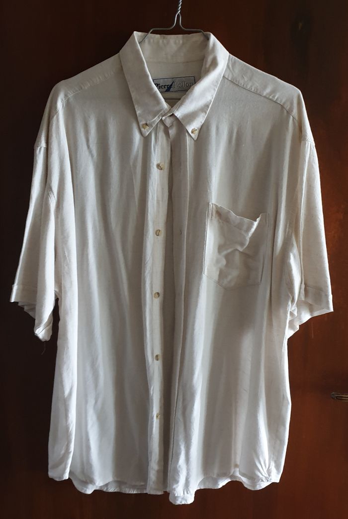 Chemise d’été à manches courtes, blanc cassé / écru en bon état. Pierre Bellon 85 % viscose 15 % lin L’étiquette de taille n’est plus visible. Les mesures prises à plat, sont données à titre indicatif et peuvent varier de quelques millimètres. - Tour de col : 40 cm - Largeur épaules : 55 cm - Largeur emmanchures : 61 cm - Longueur : 79 cm Envoi rapide et soigné.