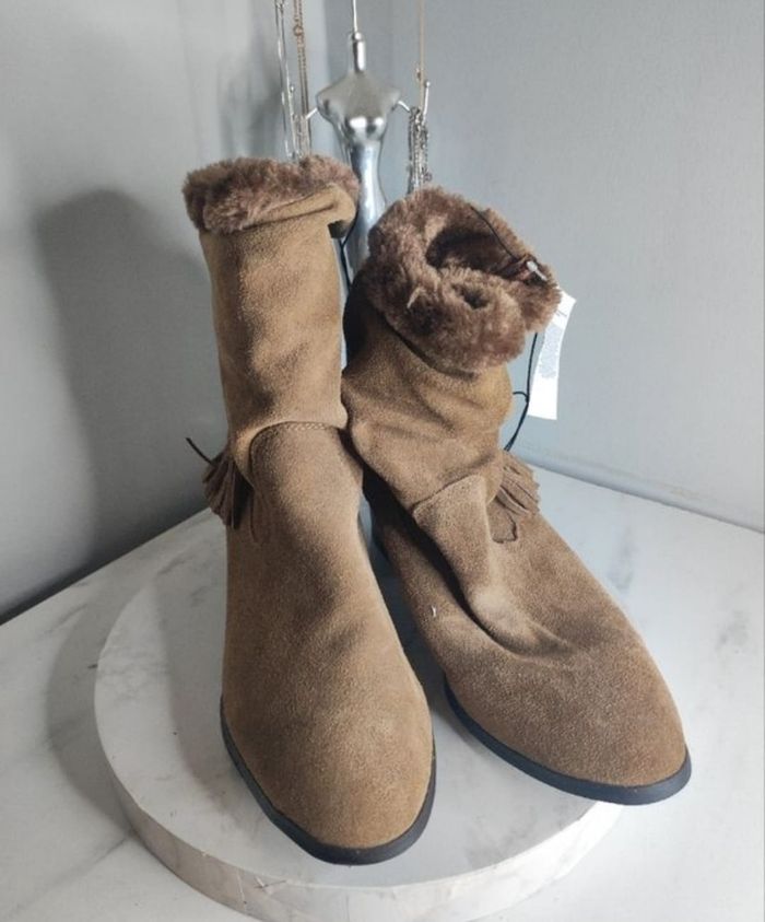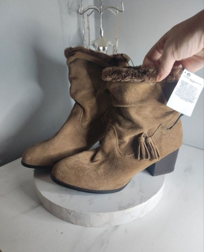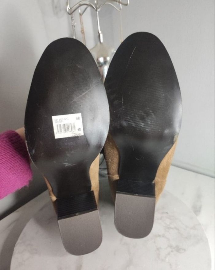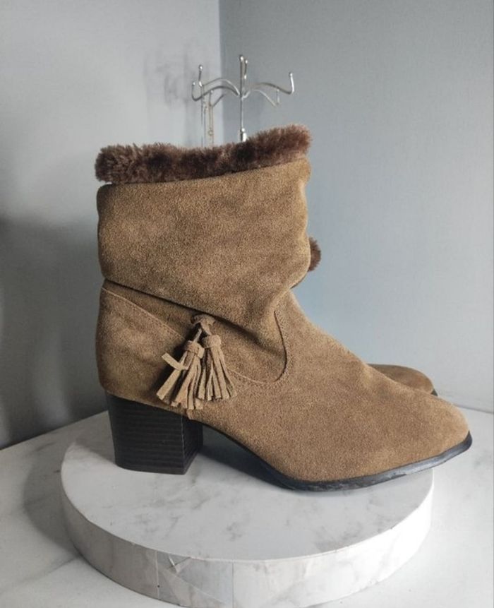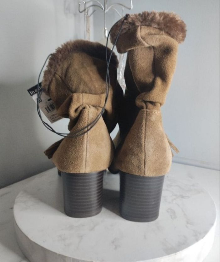 Bottines a talons fourré a l'intérieur, tiens chaud pour ces temps froids. De chez in extenso en taille 40. Peu avoir quelques traces du aux frottements avec d'autres chaussures rester dans une boite. Jamais porter