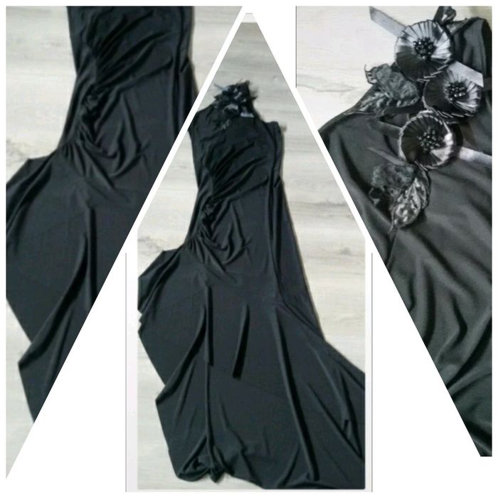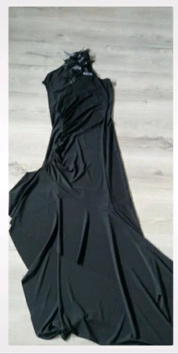 Superbe robe de soirée t36 Noire Asymétrique : longueur genou devant, cheville derrière Tissu élastique pour bien épouser les formes Jolie boutonnière fleurie