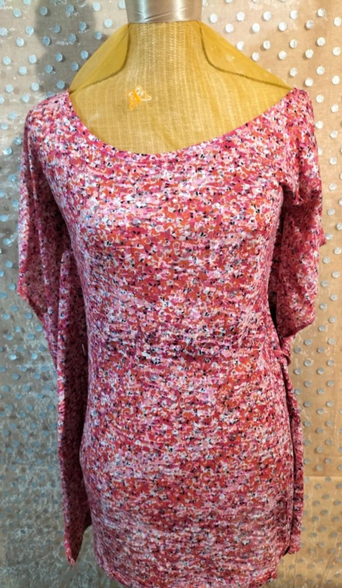 Très jolie tunique avec manches chauve-souris. Il y a également des boutonnières sur les côtés. Il devait y avoir à l'origine un ruban ou quelque chose comme ça. Il n'y a plus l'étiquette de taille, alors voici les mesures afin de vérifier : Épaules :45 cm Aisselles :76 cm Longueur totale : 78 cm