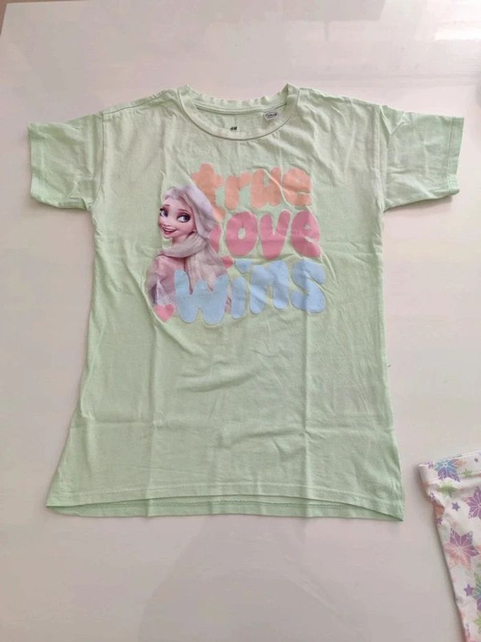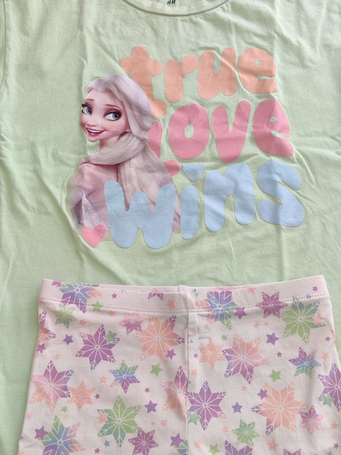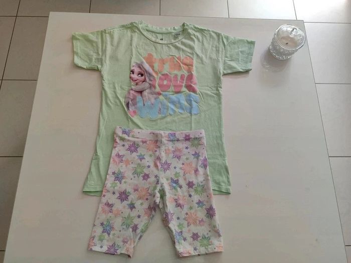 Joli pyja-short reine des neiges vert pâle. Flocage impeccable. Longueur du haut : 57 cm longueur du short : 34 cm Composition : 100% coton Ensemble en excellent état, comme neuf (porté 2 fois). 🚭 Maison non fumeur N' hésitez pas à visiter mon dressing, il est listé par # dans mon descriptif. #nerimafille8ans #nerimafille7ans #hm #reinedesneiges #disney
