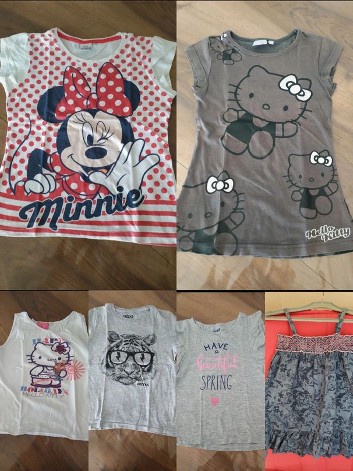 Lot composé de 4 t.shirts, 1 débardeur et 1 tunique. Plusieurs marques (Disney : Minnie, Hello Kitty, creeks...) Lot en très bon état. 🚭 Maison non fumeur N' hésitez pas à visiter mon dressing, il est listé par # dans mon descriptif. #nerimafille8ans