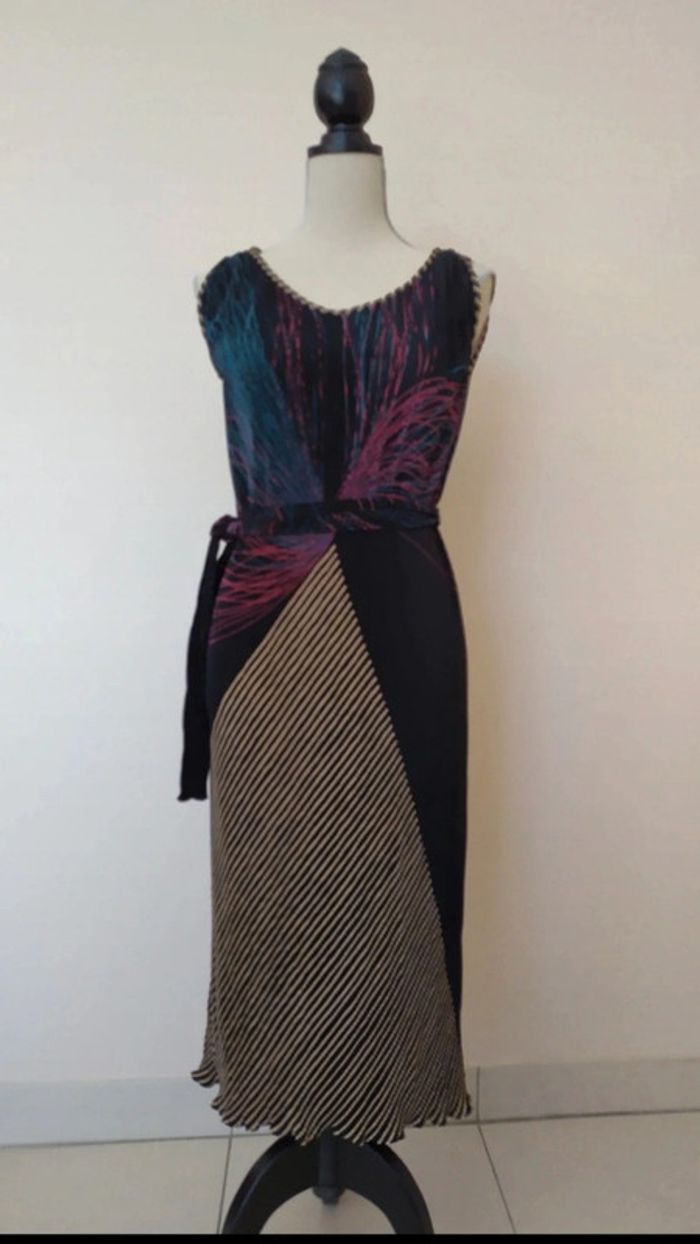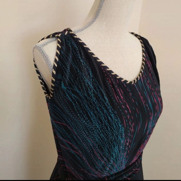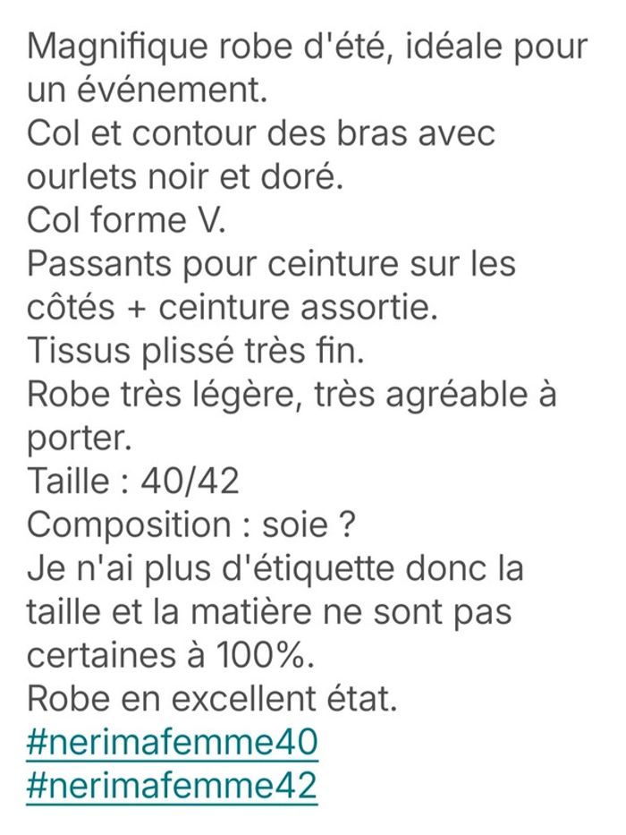 Très belle robe longue sans manches. Col en V, sous passants pour ceinture + ceinture assortie à la robe. Voir descriptif détaillé sur dernière photo. Robe en excellent état. 🚭 Maison non fumeur. N' hésitez pas à visiter mon dressing, il est listé par # dans mon descriptif. #nerimafemme40 #nerimafemme42