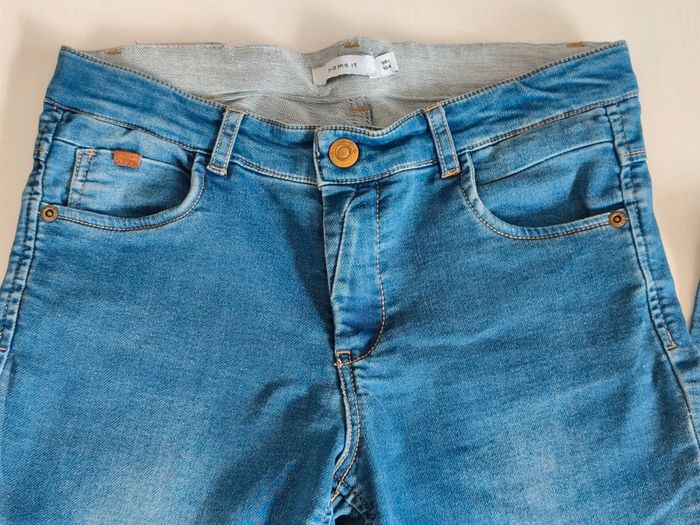 Jean bleu marine. Fermeture zippée + 1 bouton agrafe. Taille réglable par élastique intégré à la taille. Composition : 78% coton 20% polyester 2% elastane Pantalon en excellent état 🚭 Maison non fumeur N' hésitez pas à visiter mon dressing, il est listé par # dans mon descriptif. #nerimagarcon13ans #nameit