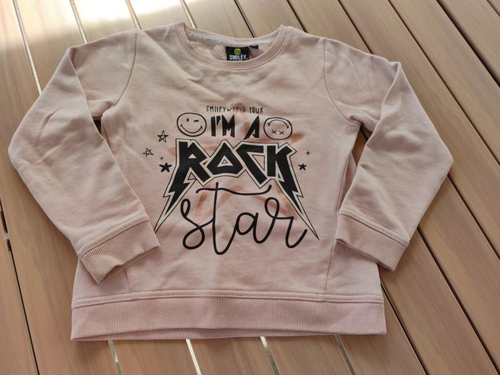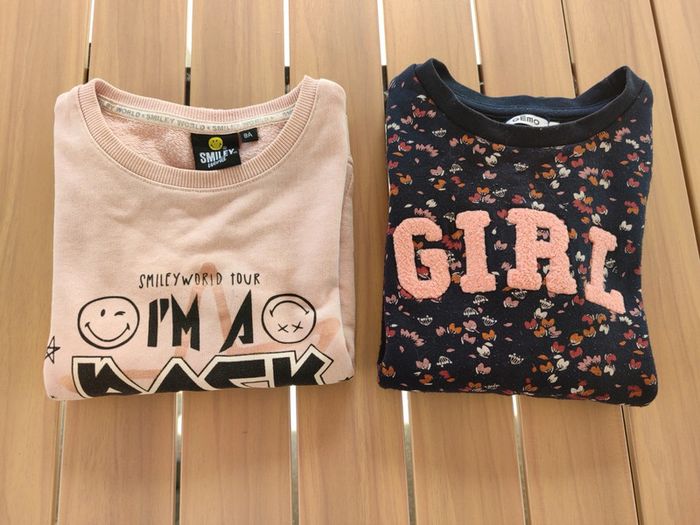 Lot de 2 sweats taille 8 ans. Un bleu à petits motifs+ écriture GIRL brodée devant. Gémo Un rose pâle avec smiley (Petites tâches cf 2 dernières photos). Smiley World. Articles en très bon état (bleu marine) et bon état (rose pâle). Composition : 60% coton 40% polyester. N' hésitez pas à visiter mon dressing, listé par # dans le descriptif. 🚭 Maison non fumeur #nerimafille8ans #gemo #smileyworld