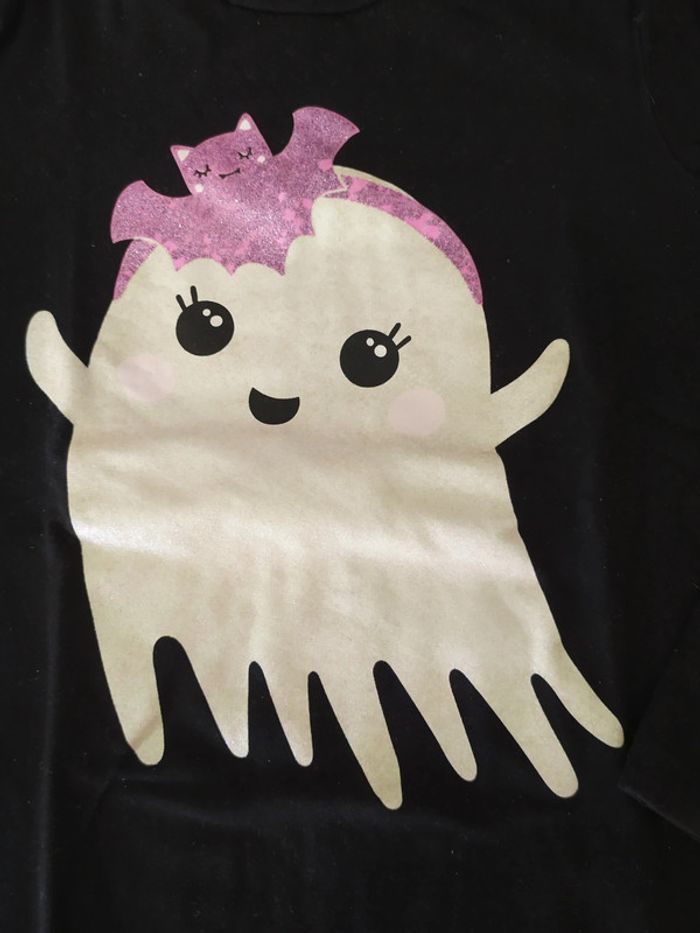Joli t.shirt noir motif flocé fantôme et chauve souris. Manches longues. Noté 7/8 ans Composition : 95% coton 5% elasthanne T.shirt en très bon état. 🚭 Maison non fumeur #nerimafille8ans #nerimafille7ans #hm