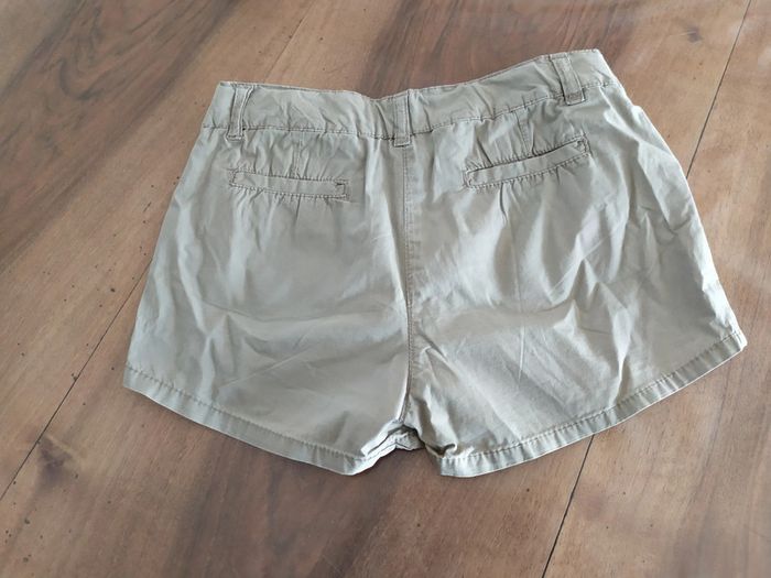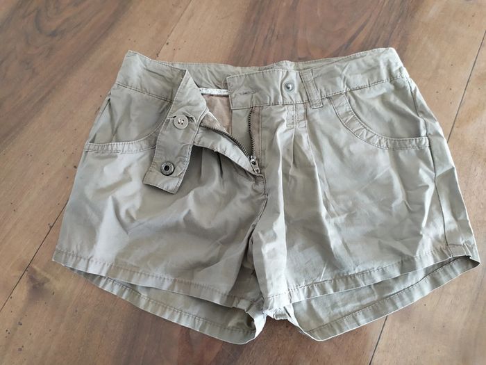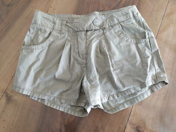 Joli short beige, très léger. Ouverture zippée + 2 boutons (dont un caché). Sous passants pour ceinture. Taille réglable par élastique à l'intérieur. Poches devant et derrière. Composition : 100% coton Short en très bon état 🚭 Maison non fumeur #nerimafille8ans #texkids