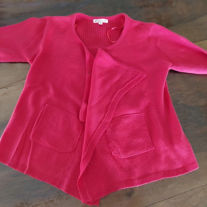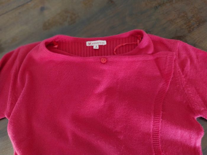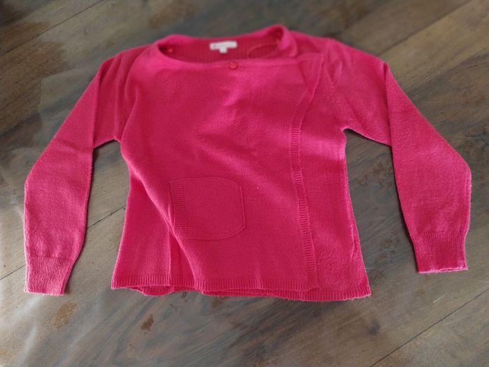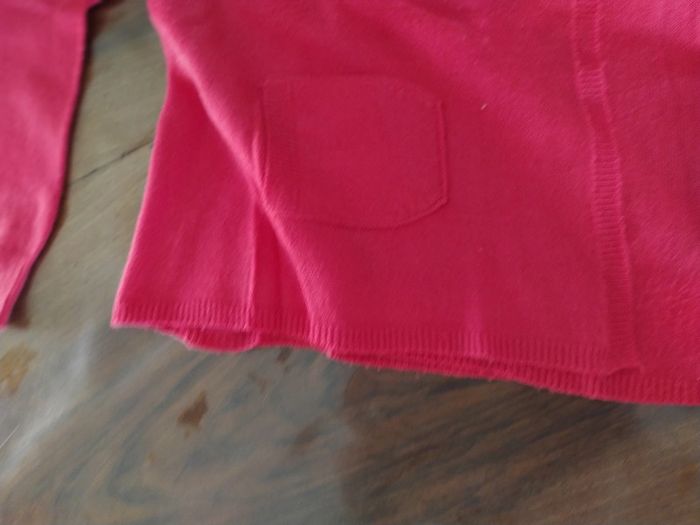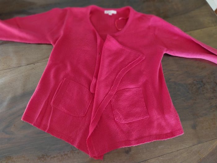 Joli gilet rose. Fermeture croisée devant par un bouton au niveau du col. Deux poches.