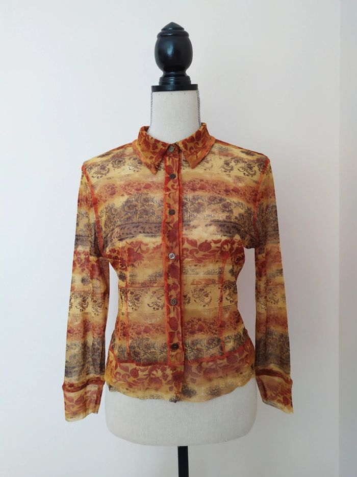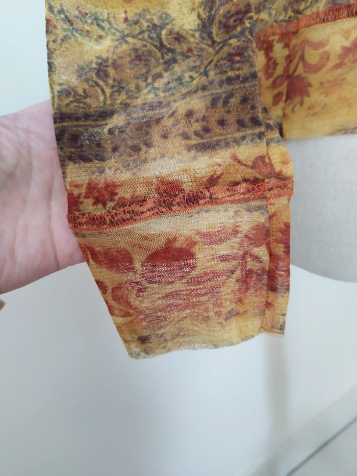 Magnifique chemisier dans les tons ocres. Cintré dans le dos. Taille : 36 Composition : polyamide, polyester et elasthanne (mais je ne connais pas les propositions exactes car il me manque l'étiquette 😞). Chemisier en excellent état. #nerimafemme36 J'ai une jupe longue et un débardeur de la même collection dans mon dressing🧐.