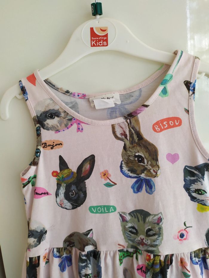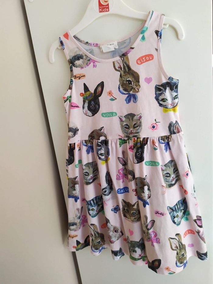 Jolie robe sans manches. Rose pâle, motifs têtes de chats et de lapins, papillons. Taille : 5 ans noté : 4/6 ans Marque : H&M Composition : 100% coton Longueur : 58 cm Robe en excellent état #nerimafille5ans #hm