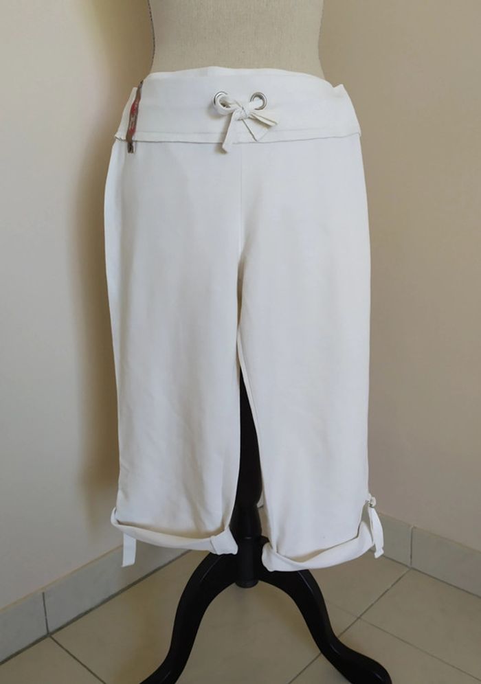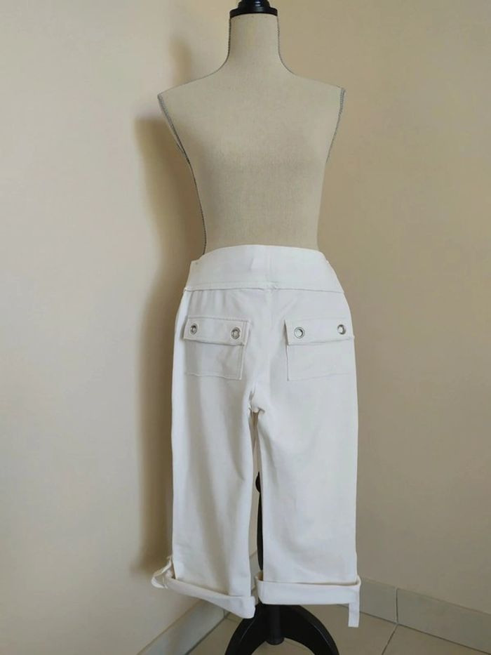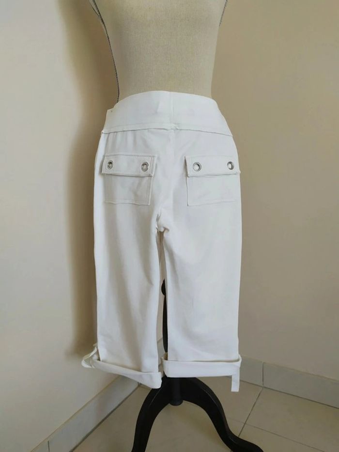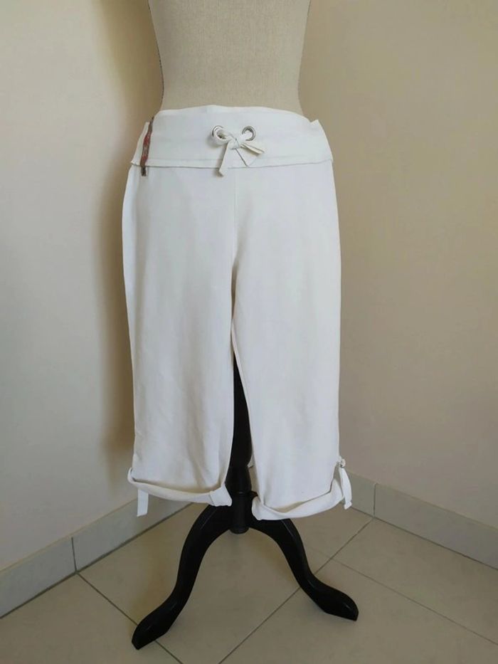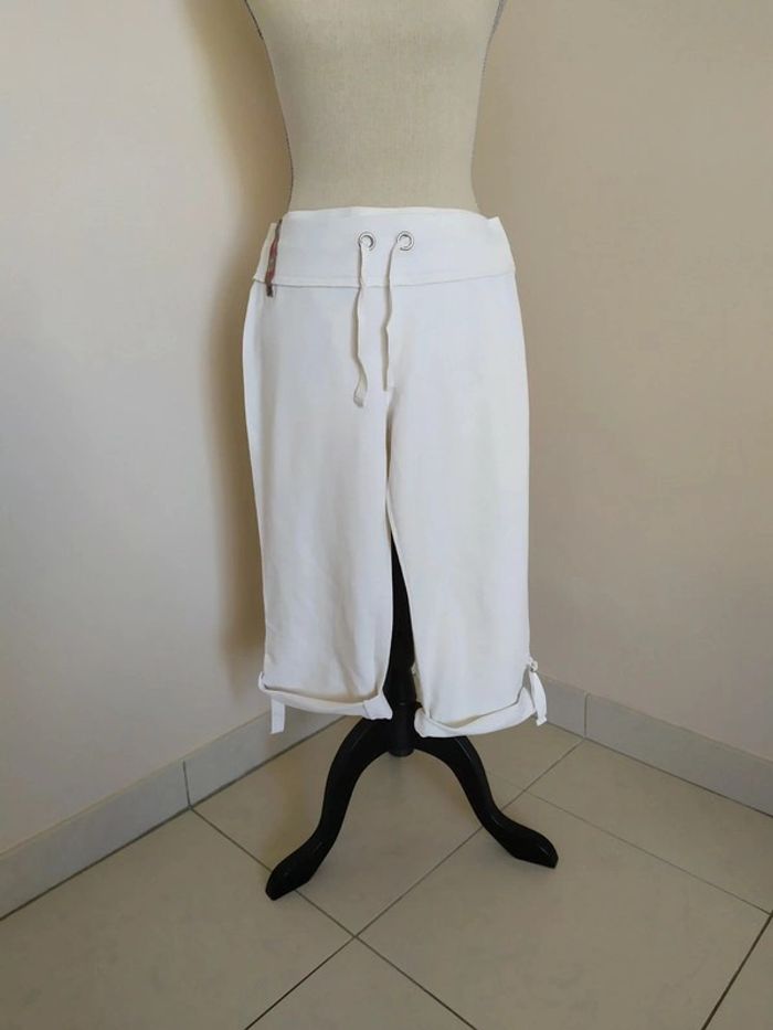 Joli pantacourt blanc style jogging. Taille élastique, avec liens de serrage devant. Longueur des jambes réglable. Deux poches derrière. Taille : S Marque : Tex Composition : 96% coton 4% elasthanne Pantacourt en très bon état (peu porté). #nerimafemme36 #tex