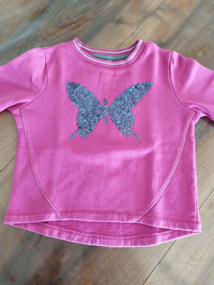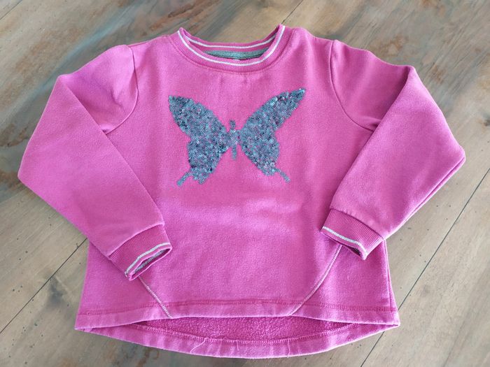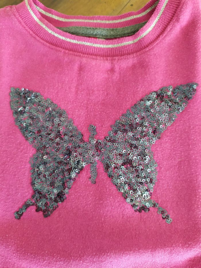 Joli sweat de couleur rose foncé, col et bout des manches avec un liseret argenté. Le dos est légèrement plus long en arrondis. Motif papillon en sequins gris foncé fixes brodés. Taille : 6 ans ( il taille un peu petit, début 6 ans🤗). Marque : Orchestra Sweat en excellent état ( peu porté). #nerimafille6ans #orchestra