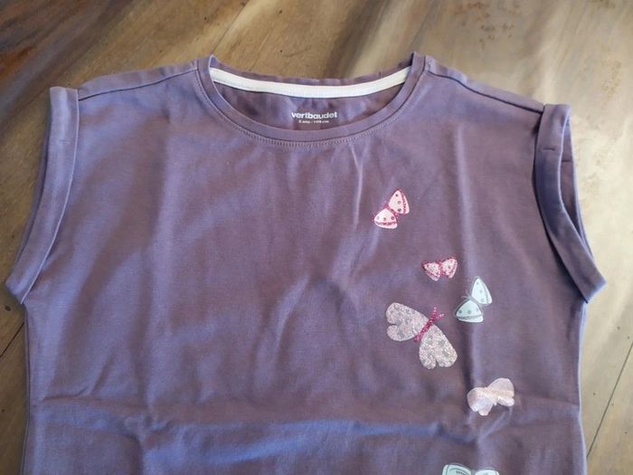 Joli t.shirt violet décoré de petits papillons roses. Manches ultra courtes avec un petit revers fixe. Bas du dos légèrement plus long et arrondis. Taille: 5 ans marque : Vertbaudet Composition : 95% coton 5% elasthane T.shirt en excellent état, comme neuf #nerimafille5ans #vertbaudet