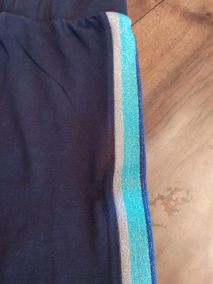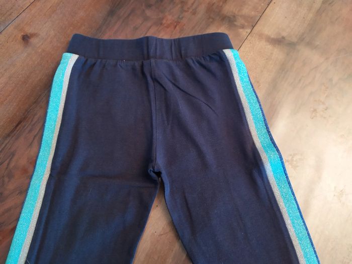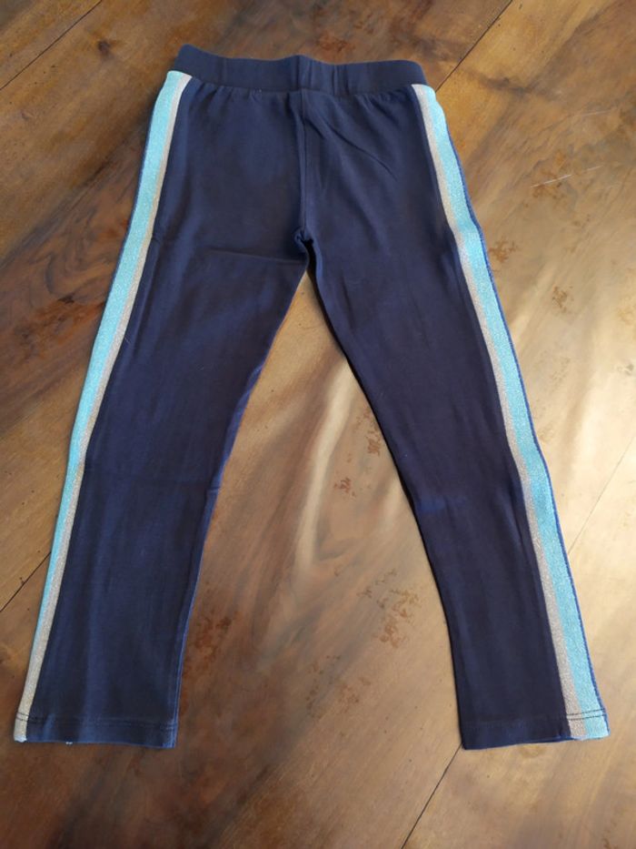 Joli legging bleu marine avec des bandes bleu et argenté brillantes. Taille élastique. Taille : 5 ans Marque : U essentiel Composition : 95% coton 5% élasthanne Composition bandes : 85% polyester 5% fibres métallisées. Legging en très bon état #nerimafille5ans #uessentiel