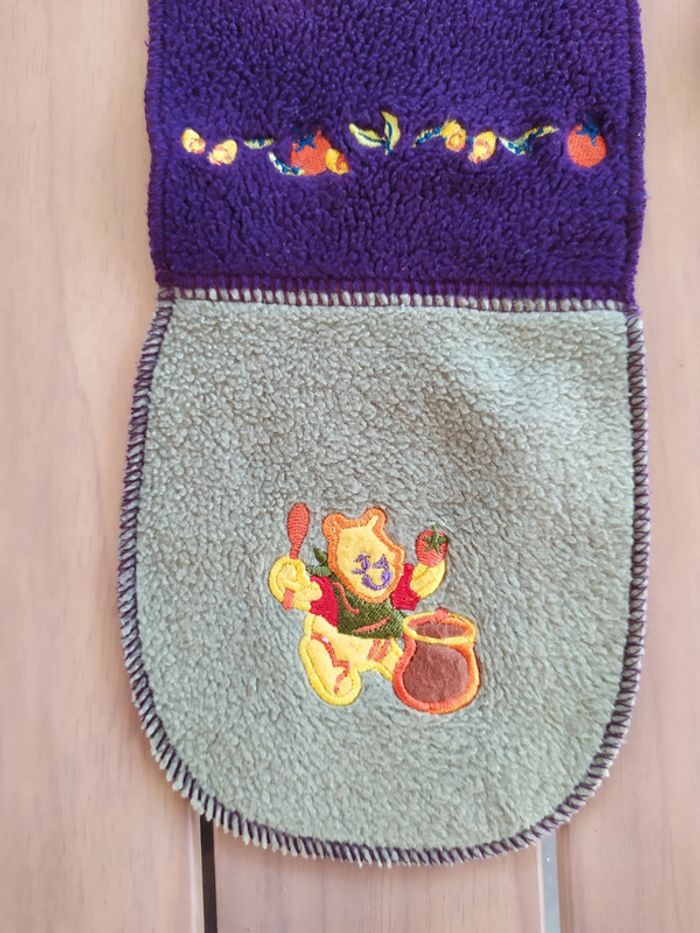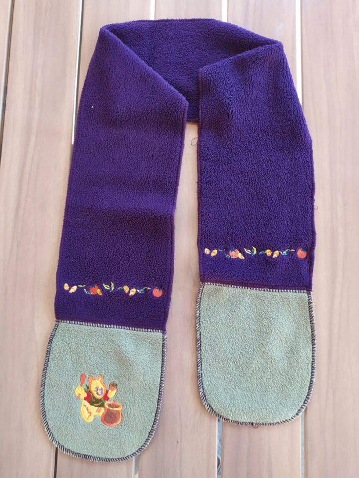 Jolie écharpe Winnie l'ourson Couleurs violet/kaki. Motifs liseret de fruits de chaque côté et un petit Winnie avec son pot de miel🍯 sur le bout gauche. Écharpe bien chaude. Longueur : 101 cm Composition : 100% polyester Écharpe en très bon état. #nerimadiversenfant #disney #winnielourson